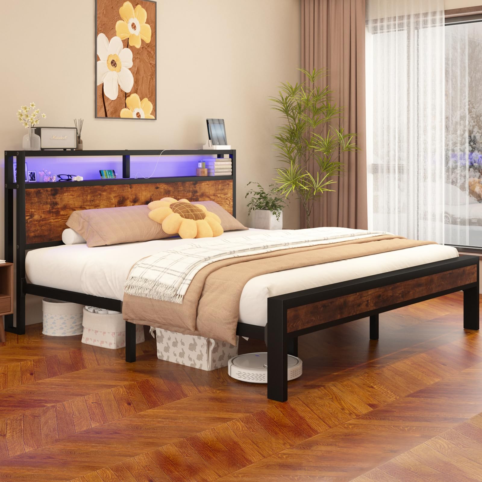 LoVinson Queen Size Bed Frame with LED Lights, 2-Tier Storage Headboard with Charging Station, Wood Slat Support, No Box Spring Needed, Noise Free, Easy Assembly, Rustic Brown