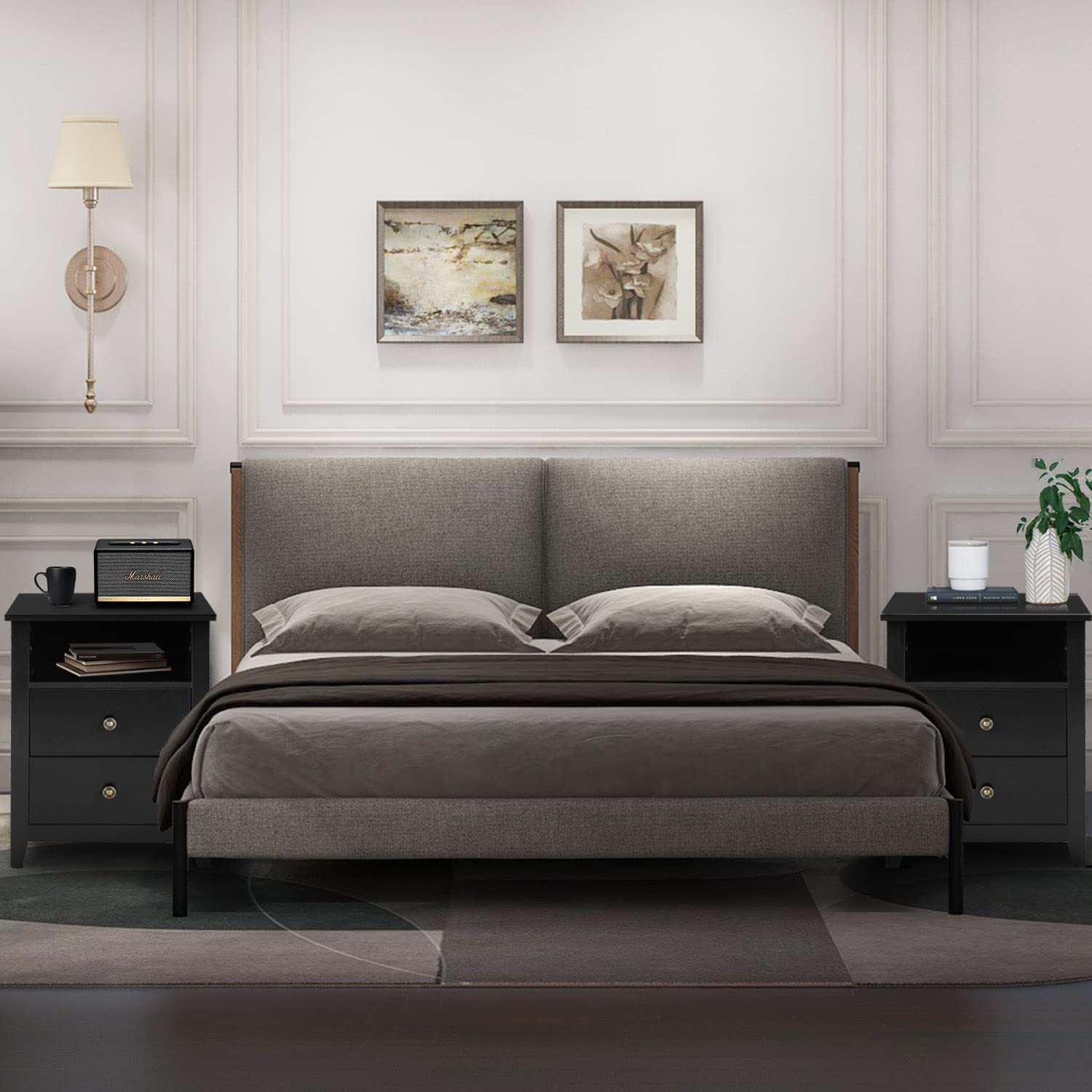 Black Nightstand Set of 2, Bedroom Nightstand with 2 Storage Drawers