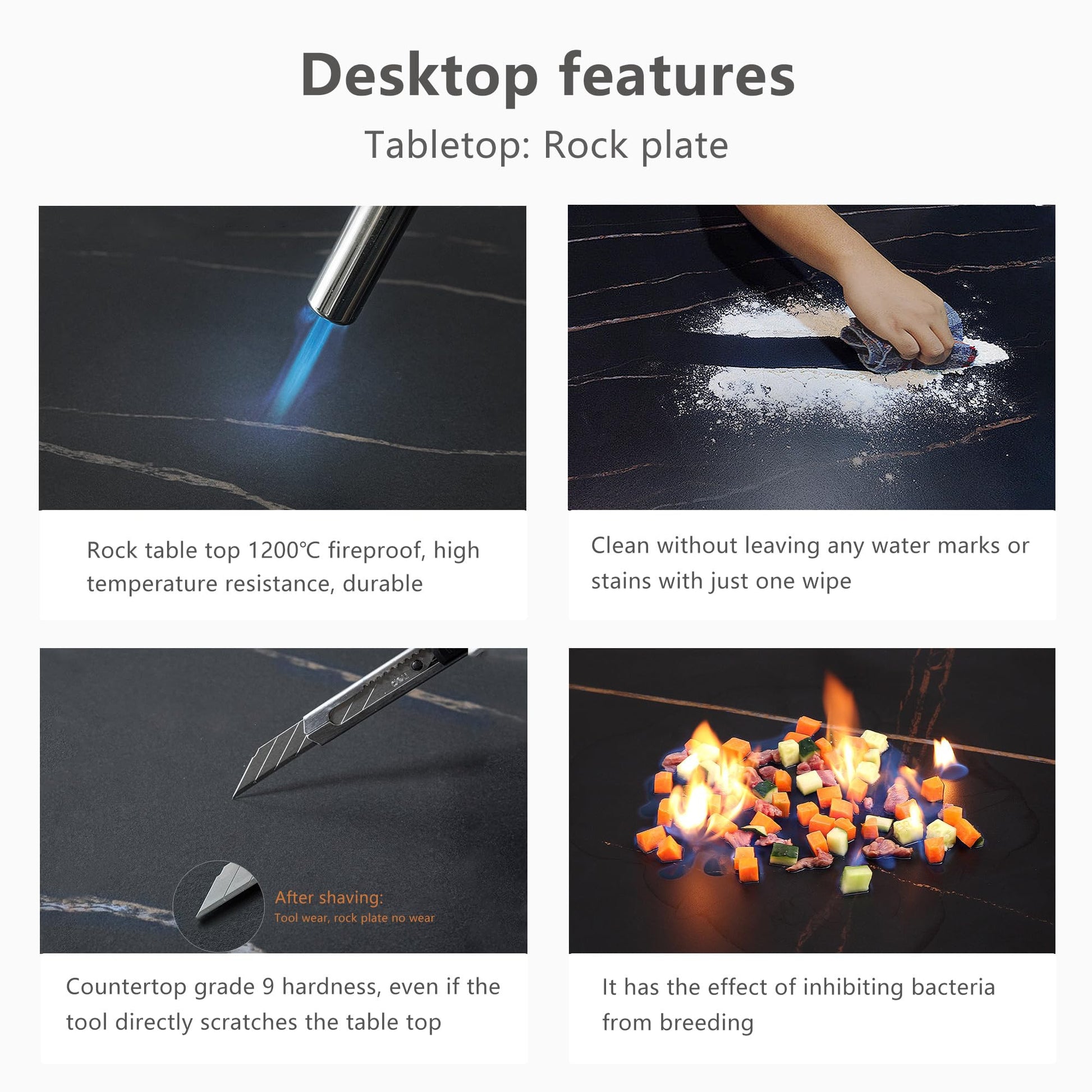 - The table top is manufactured by rock burning with high-pressure and 1200° high-temperature. So, our table top has a very high hardness resistance (Mohs hardness level 9). You can cut food directly on it.
