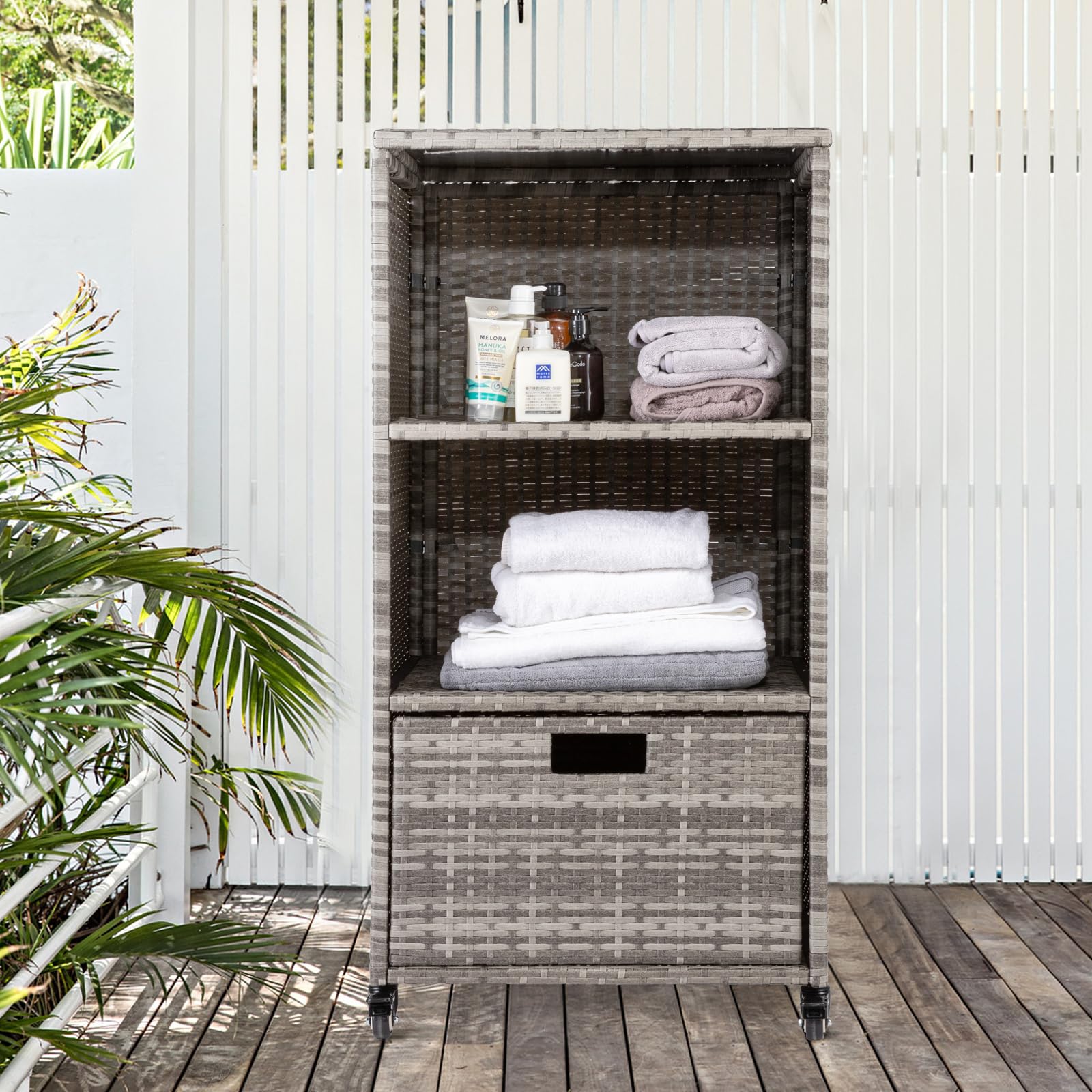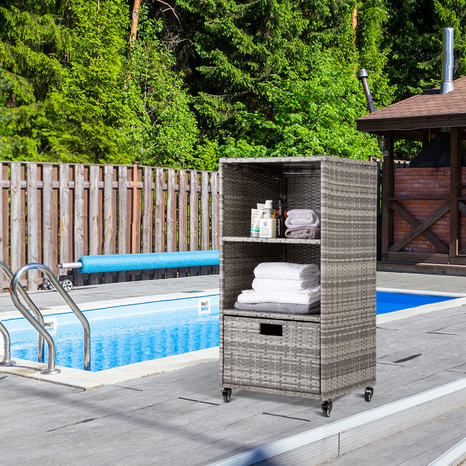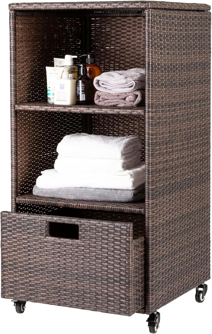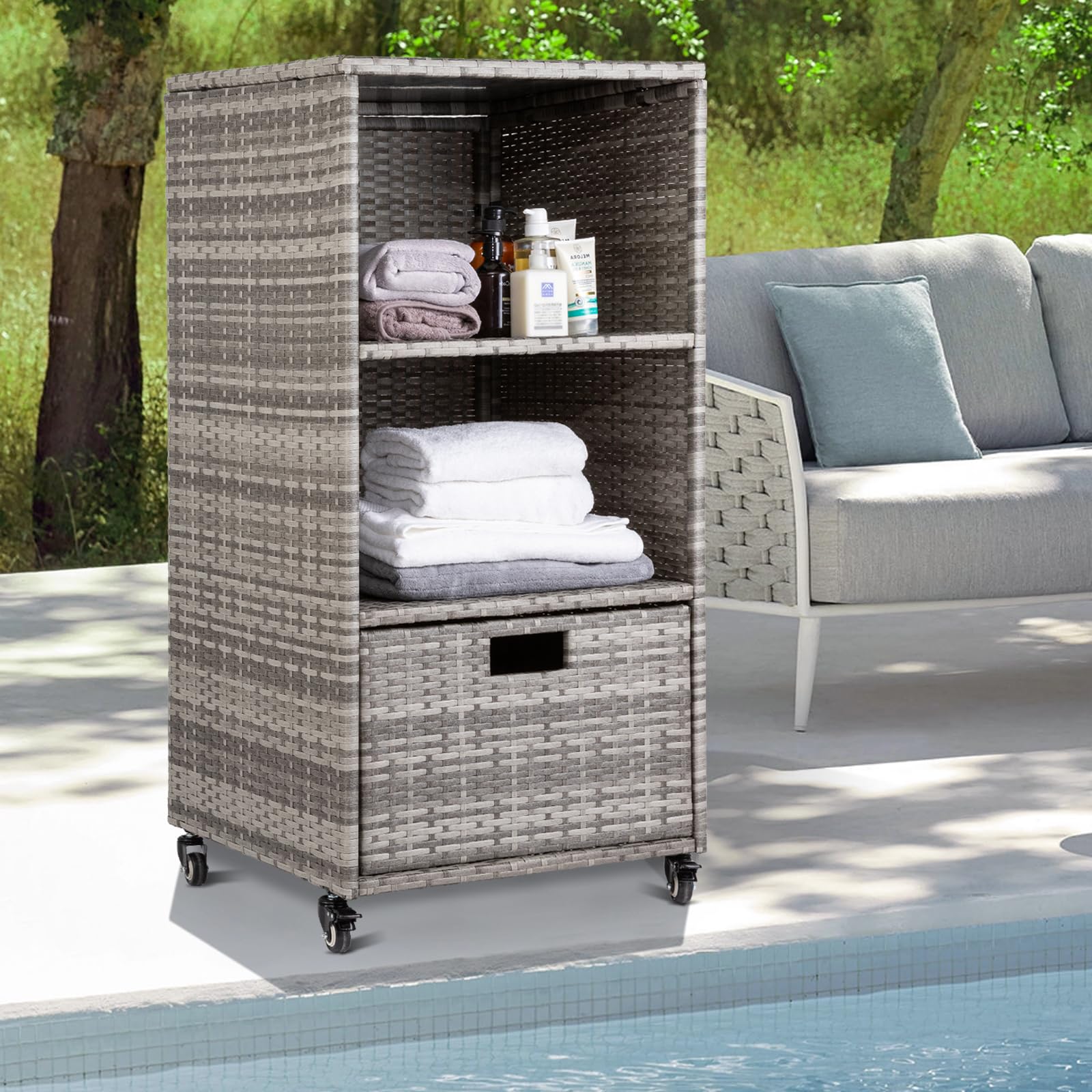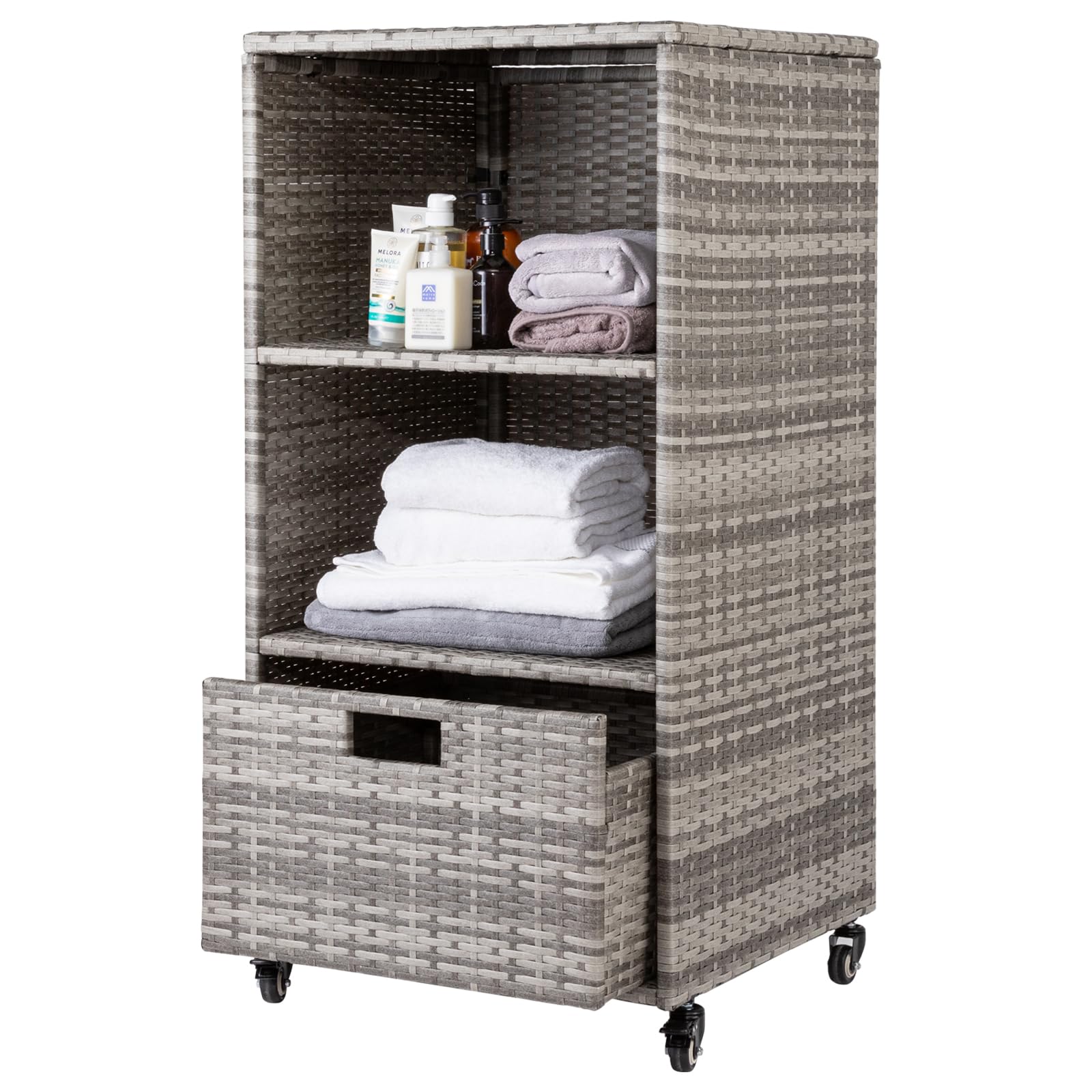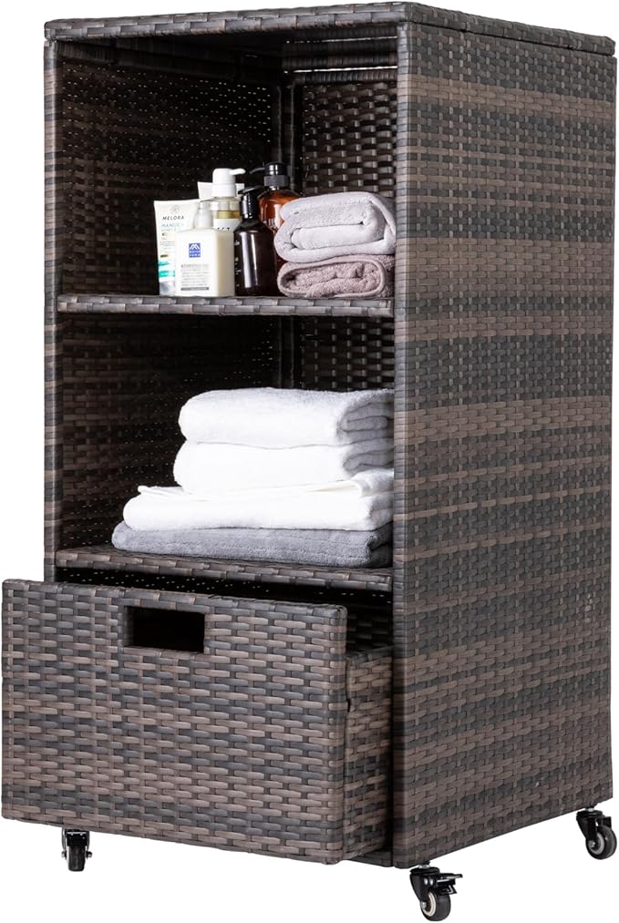 - 2 Layer and 1 Drawer: This pool towel cabinet is designed with 2 layer shelf and 1 bottom drawer for outdoor storage. It is sturdy enough for toting pool toys, towels, and accessories around the pool and house. You can also pull out the bottom drawer to store your pool accessories