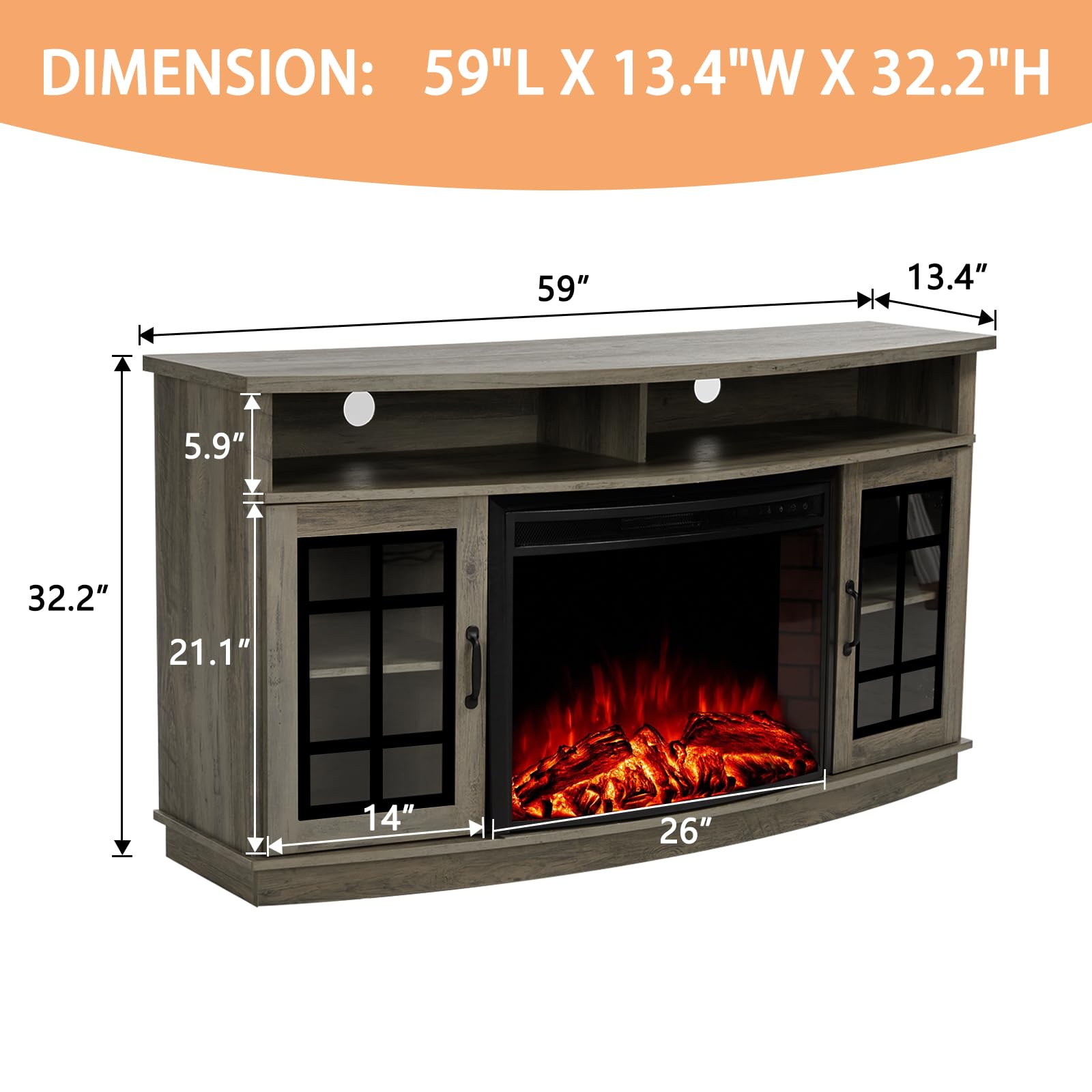 - Size: TVstand- 59" W x 32.2" Hx 17.7" D. Perfectly accommodates flat and curved TVs on the market, up to 65", 90 lbs. Electric Fireplace Dimensions: 26" W x 21.26" H
