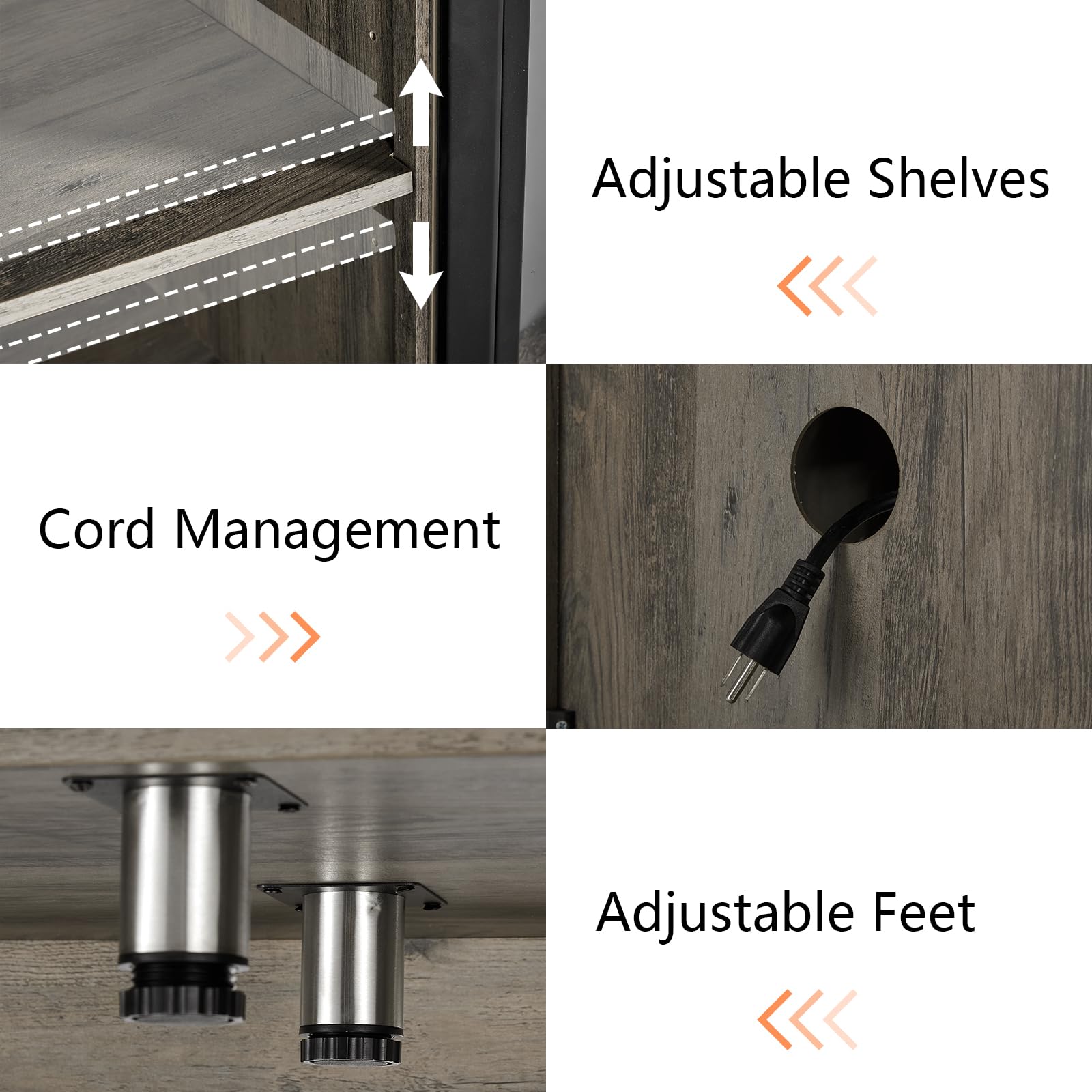 - Storage Space: Larger tabletop and open storage space, 2 closed glass storage cabinets with adjustable shelves. Cable management on the back keeps cords organized. Can be used as a TV cabinet or a storage cabinet.