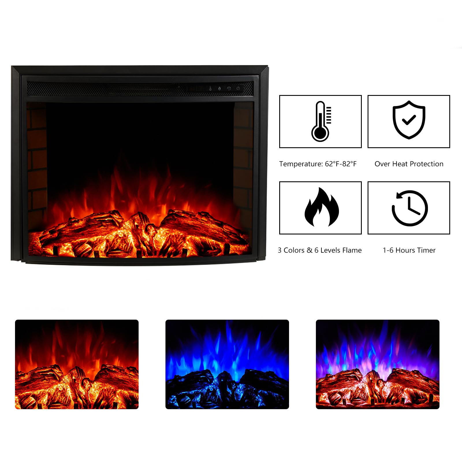 - 26" Curved Glass Fireplace: Lifelike 3D logs/rustic red brick walls/3 flame colors/6 levels dimmer. Curved glass panels give you a larger viewing area. Flame and heat are controlled separately for energy savings and warmth. (Remote control and button operation)
