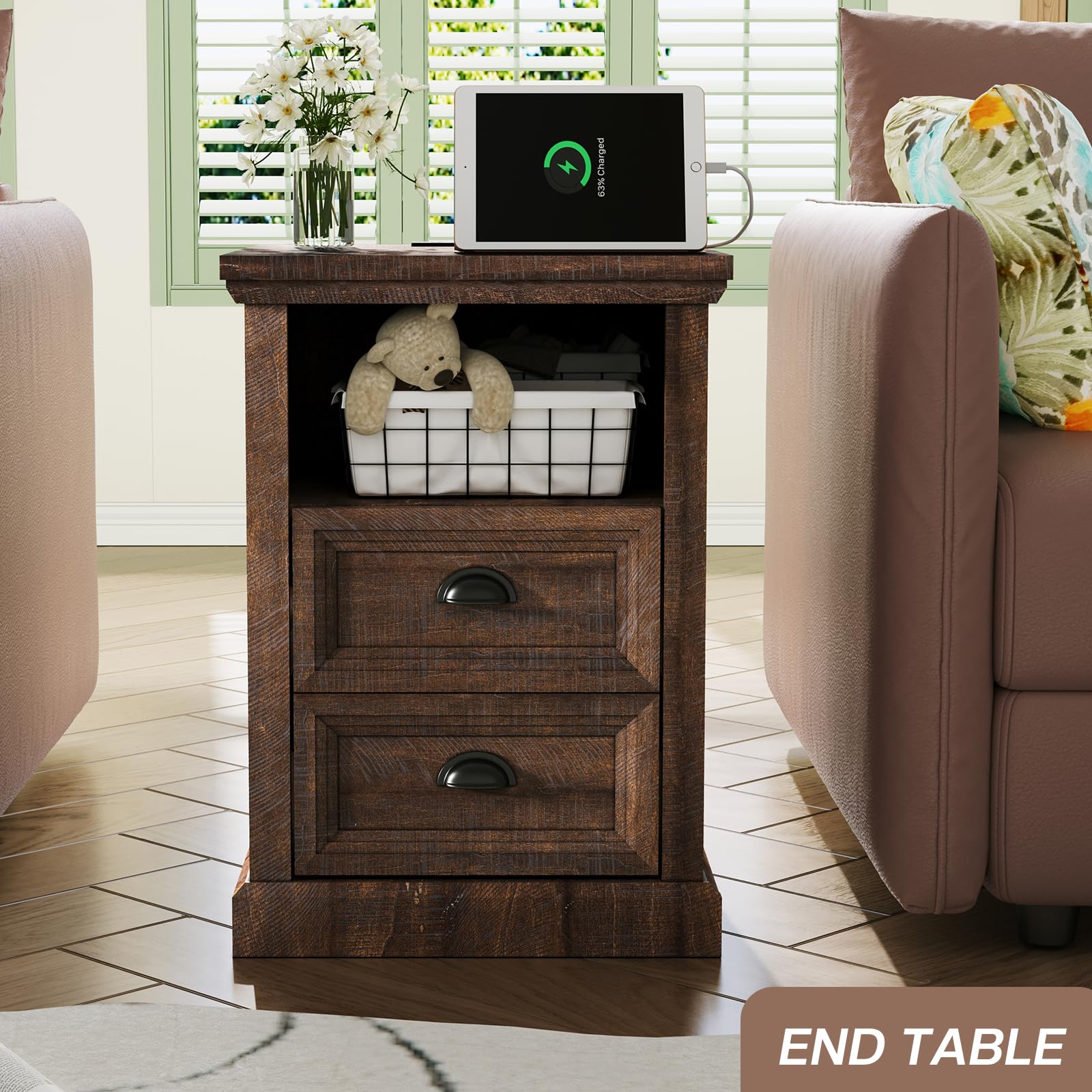 Farmhouse End Table with Charging Station, Nightstand
