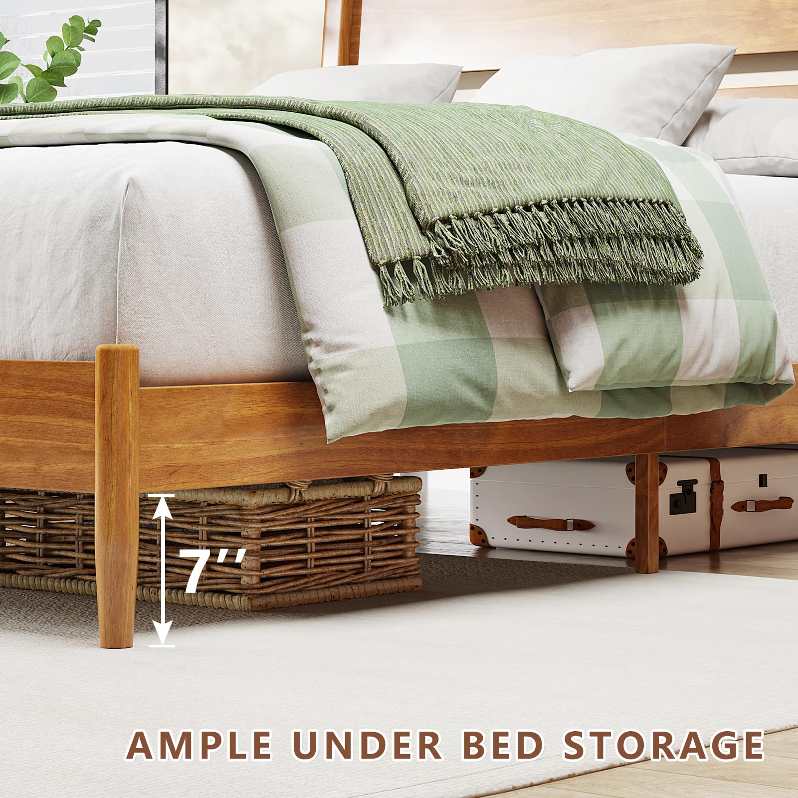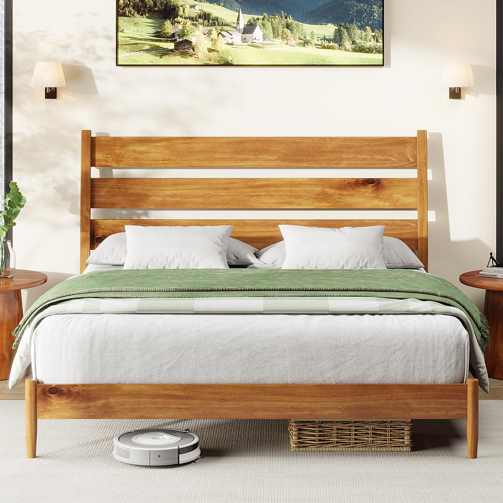 Solid Wood Bed Frame with Ergonomic Headboard, Full Size Mid Century Wooden Platform