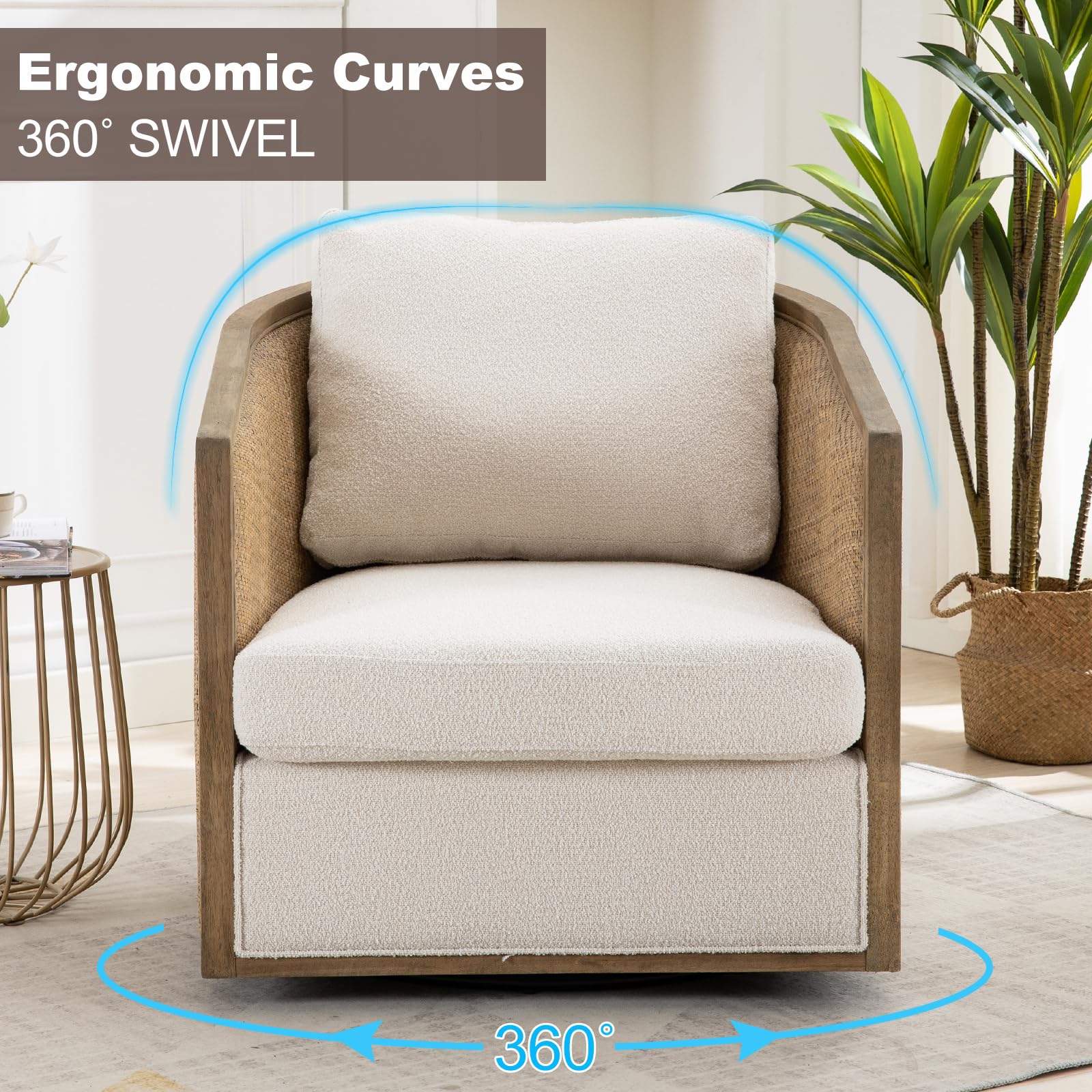 Swivel Accent Chair,Upholstered Armchair with Cushion Back,Rattan Frame,Boucle Accent Chair for Living Room,Bedroom,Office,Waiting Room (Beige)