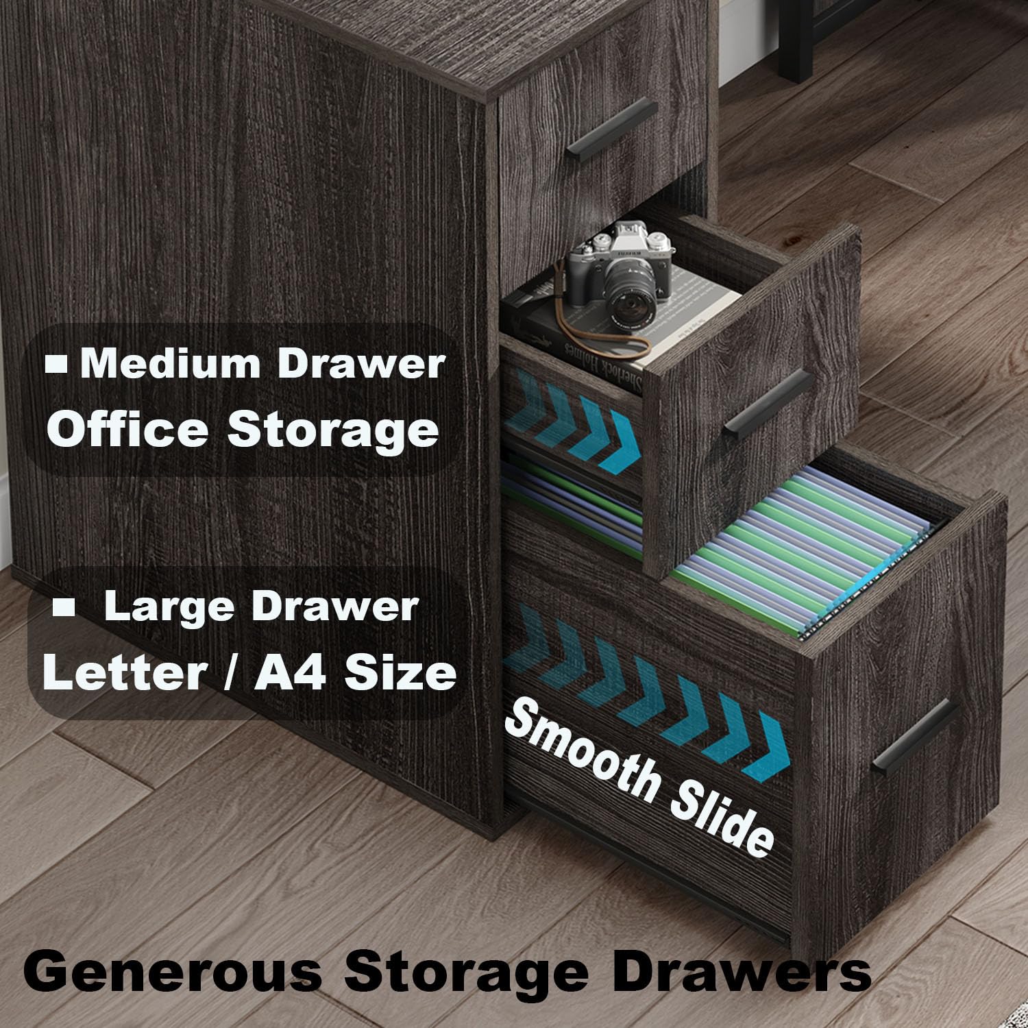 - The 59.1"/55.1" W x 19.7"/15.7" D x 30.0" H L-shaped desk offers versatile functionality, not only accommodating computers, monitors, and keyboards but also providing ample workspace for file organization, writing, drawing, and more. Additionally, this L shape desk features three drawers: two medium-sized drawers ideal for storing office supplies and miscellaneous items, and one large drawer designed for file folders. Beneath the desk, there is an open shelf, perfect for conveniently accessing frequently used items. These storage options ensure efficient organization and management of office supplies.