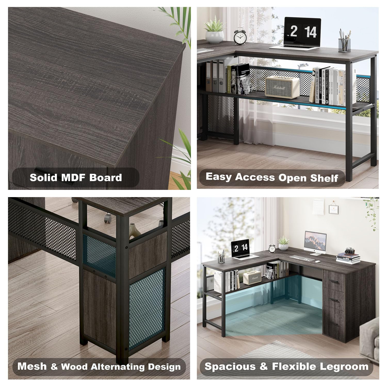 - Reversible L Shaped Computer Desk create a multifunctional work area, allowing you to switch between different activities more easily and improving work efficiency. For example, you can use one area for computer work and another area for handwritten notes or file organization, thereby completing tasks more effectively.