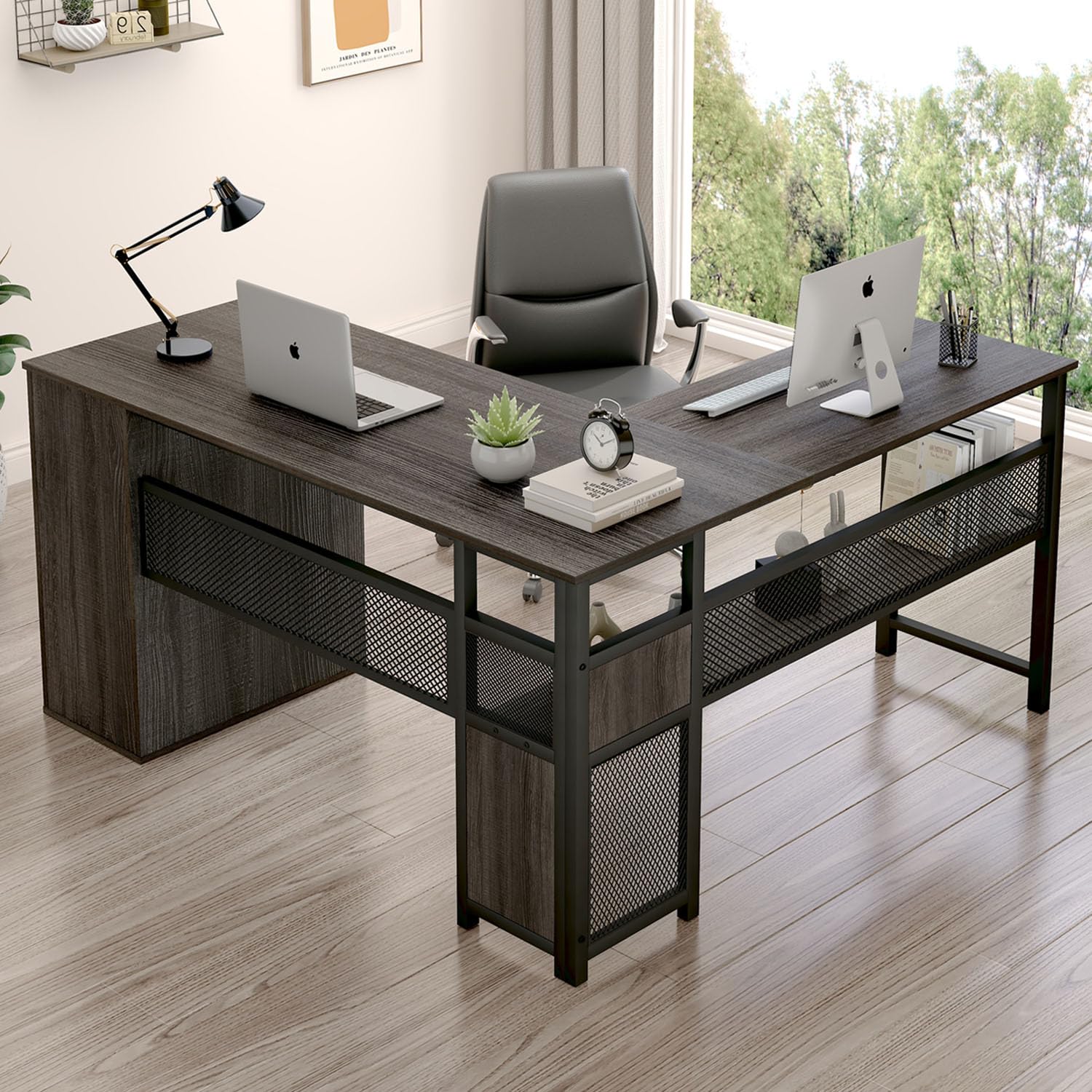 - This wooden executive computer desk combines solid premium engineered wood panels with rugged iron components, ensuring exceptional durability. Meticulously engineered for resilience and longevity, every detail reflects high-quality craftsmanship. The L-shaped design, featuring an industrial-style aesthetic with mesh and wood panel interplay, adds a distinctive character, setting it apart from the rest.