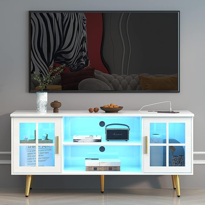 - Modern Unique Design: LVSOMT TV Stand is equipped with 2 USB power outlets, providing charging for your TV, game gears, and other electrical appliances. Unique body induction design can control lights within 3 meters, adding fun to your life. LVSOMT TV cabinet allows you to keep light in a short or long time