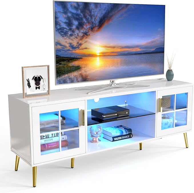 - LVSOMT Modern TV Stand: Size: 59'' L x 16" W x 16.7" H.It can accommodate TVs below 70 inches. Thick materials can accommodate up to 110 pounds of desktops and 22 pounds of glass shelves, beautiful and practical