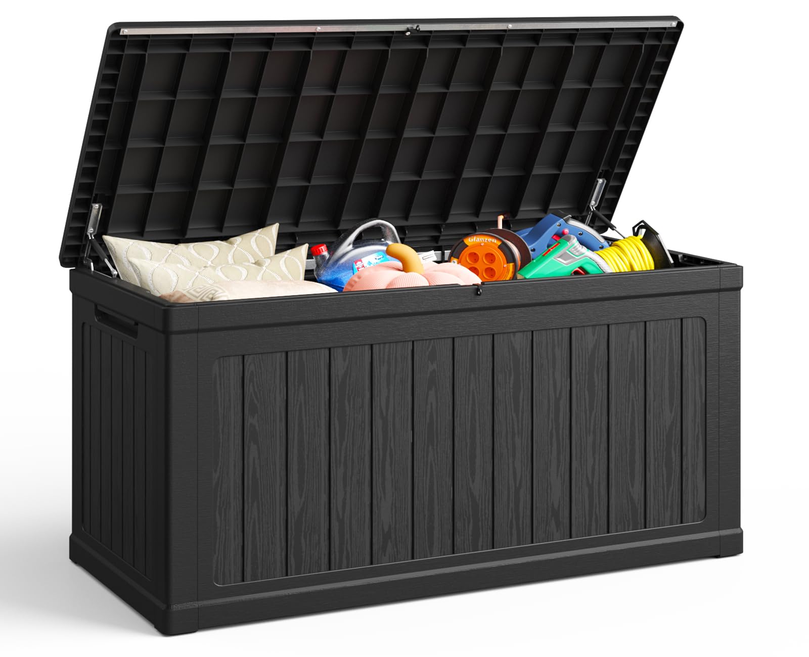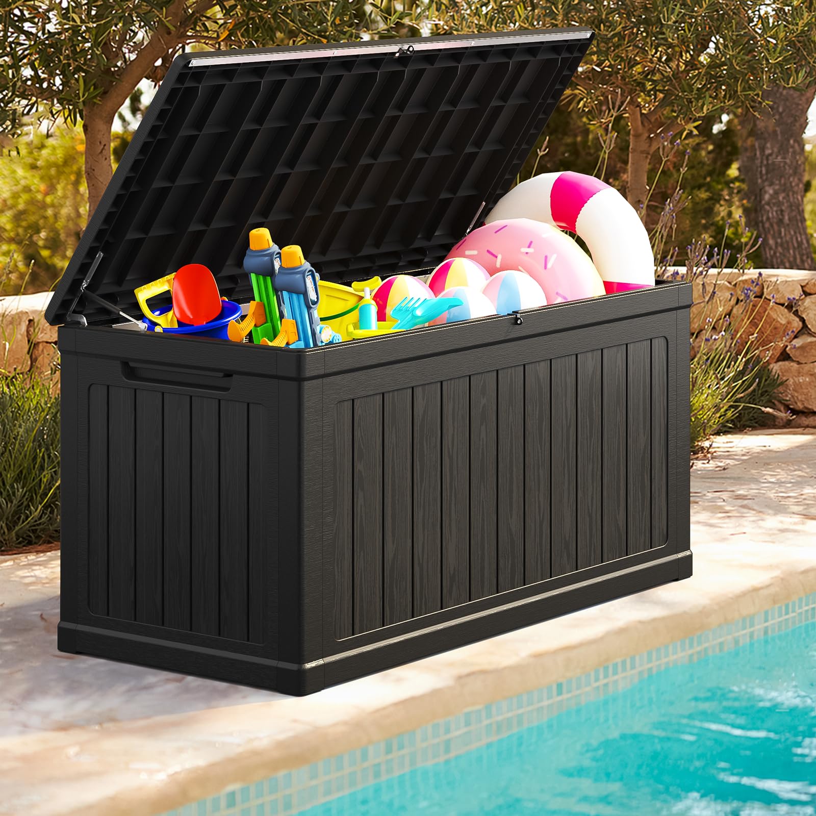 - Effortlessly tuck away bulky pool floats, gardening supplies, and patio decor in this 230 gallon large deck box, preserving your outdoor oasis’s sleek aesthetic