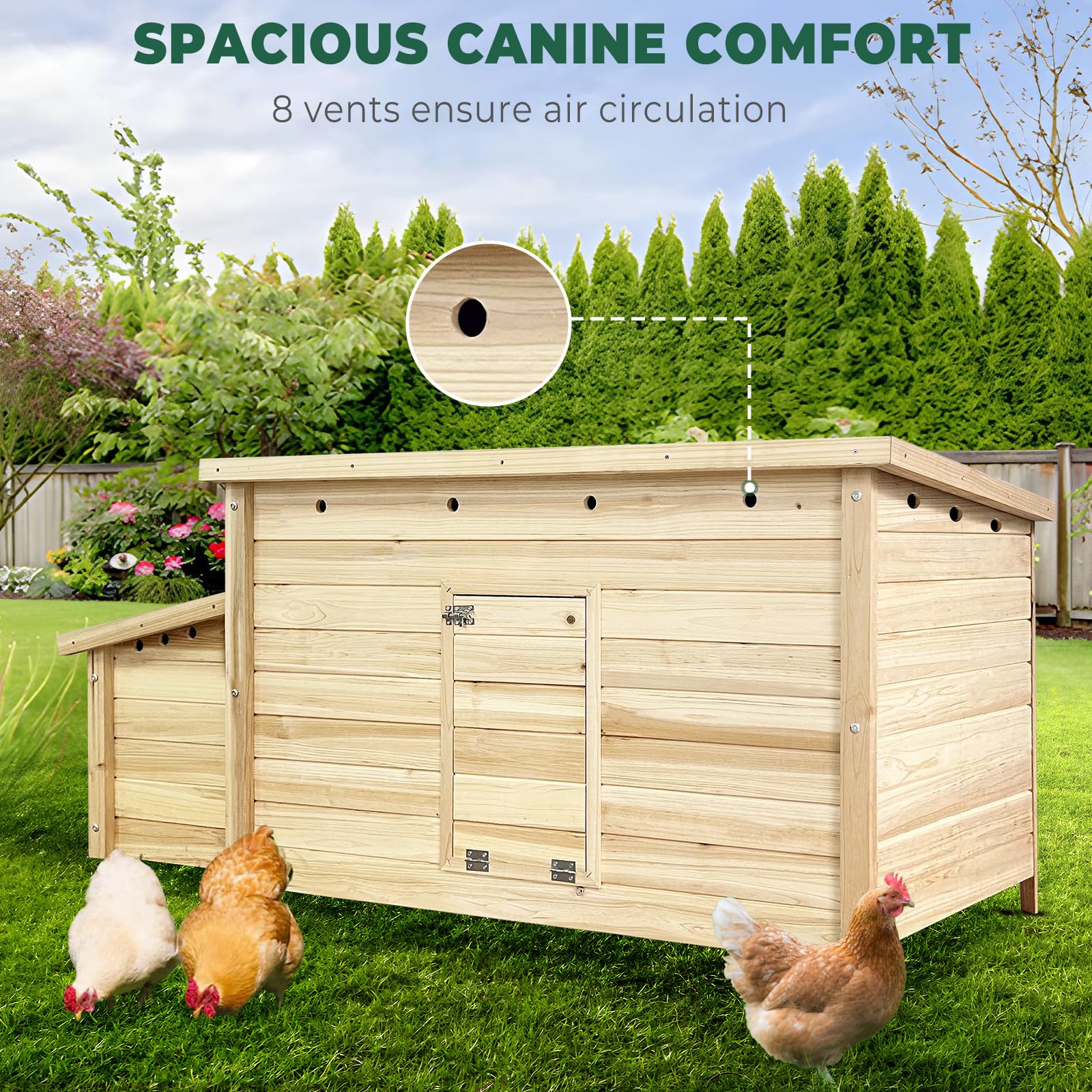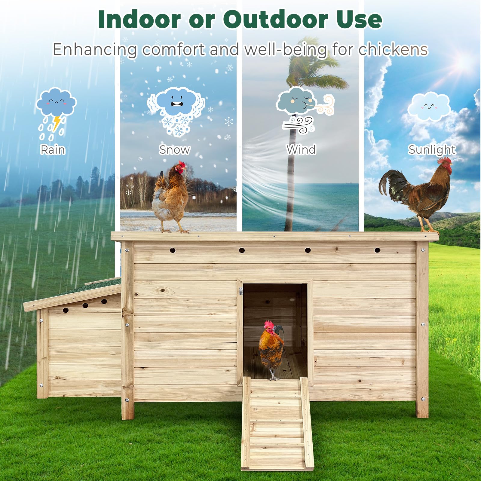 - The roomy interior and adaptable exterior design make it an ideal fit for various settings, positioning it as the great choice for your backyard wooden chicken coop. Overall dimensions: 57.68''L x 27.56''W x 27.95''H, comfortably housing 3-5 normal adult chickens for rest