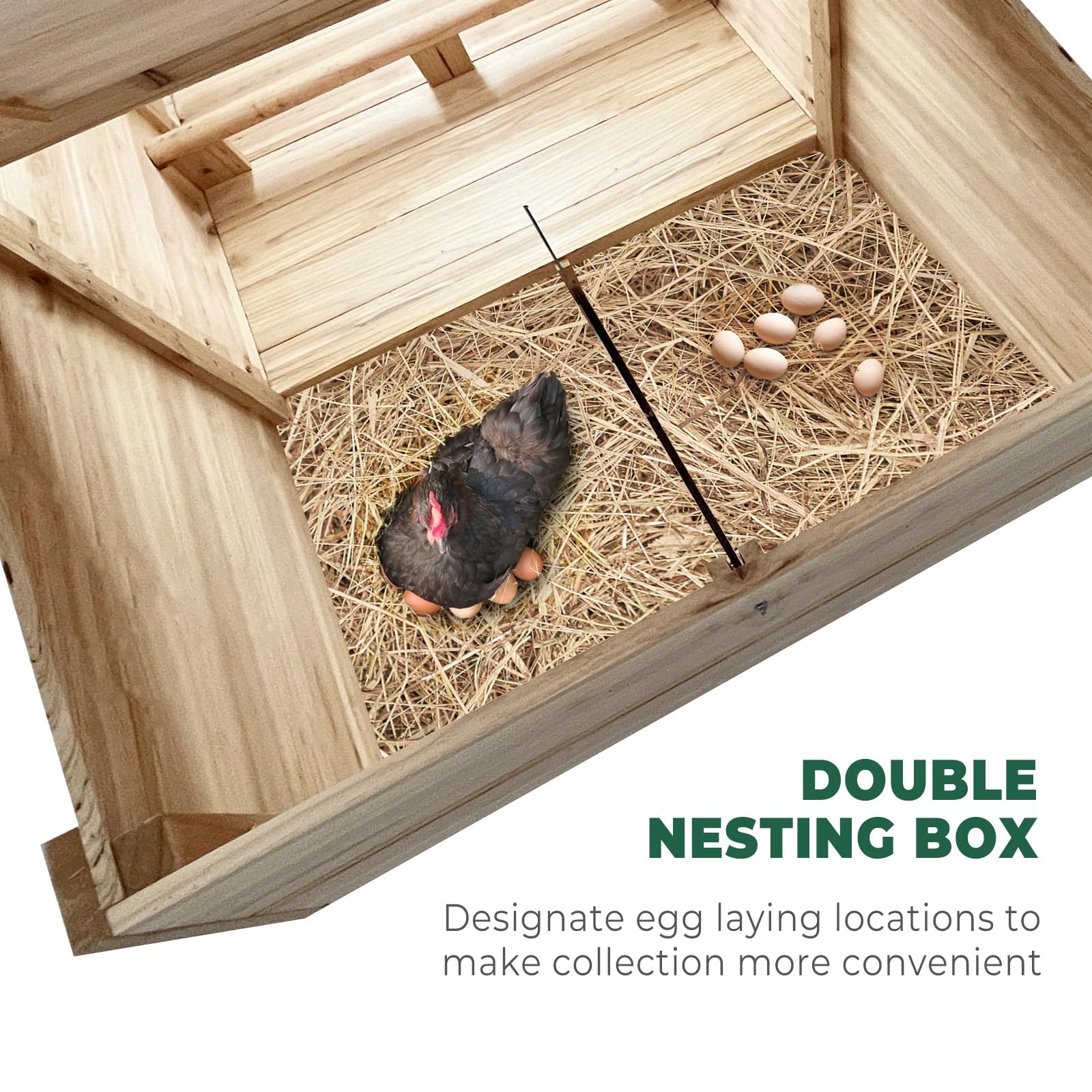 - The spacious chicken nesting box offers a cozy and secure space for your chickens to lay eggs. Removable divider creates two separate areas, allowing simultaneous egg-laying by two hens without interference. The roof that can be opened provides convenient access for collecting eggs at any time