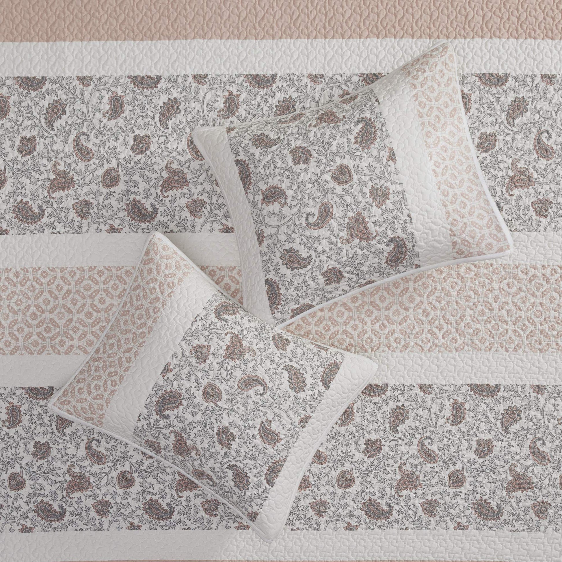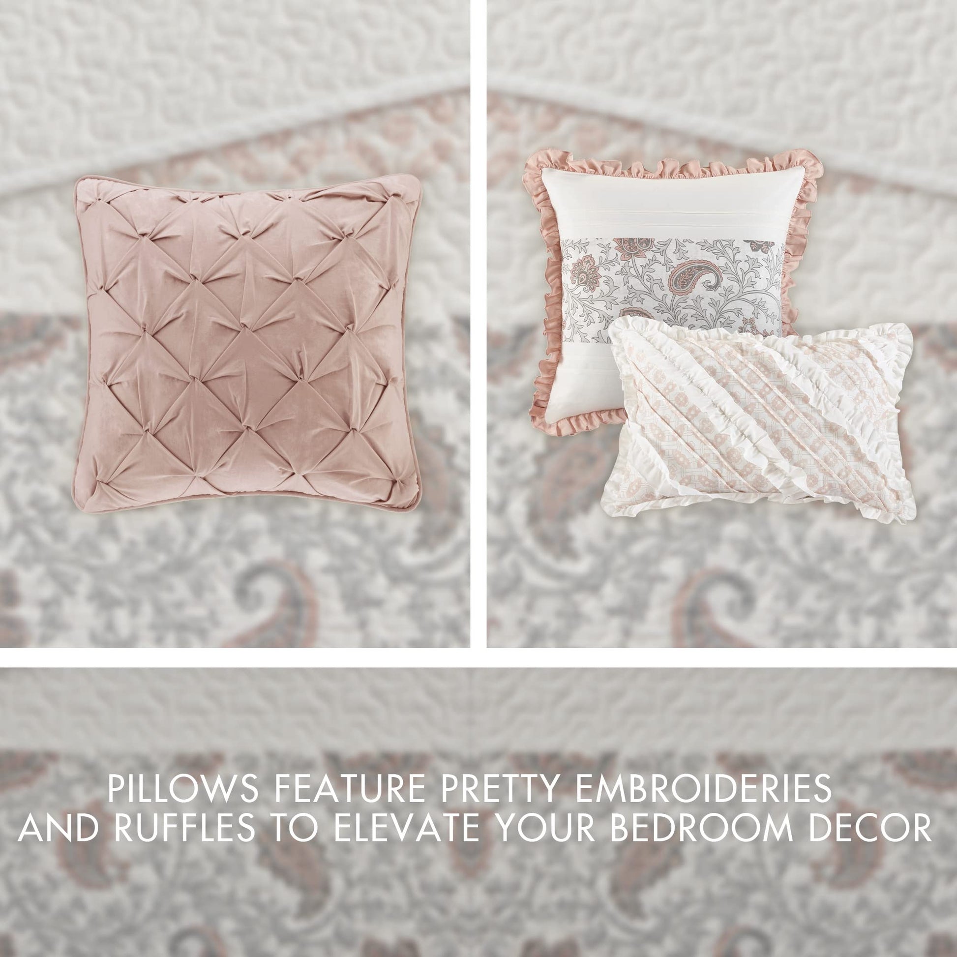 - A paisley print is featured on the cotton coverlet with pintucked fabric separated by lace taping embellishments.