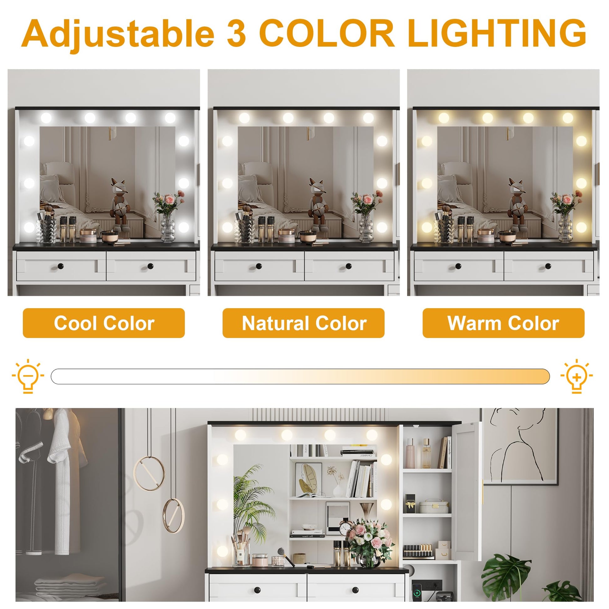 - 10 Light Bulbs With 3 Colors: This make up vanity comes with a large square mirror and 10 LED lights, provide 3 color modes, warm yellow, warm white and cold white, so you can choose the most comfortable color in different makeup needs, it will light your beauty
