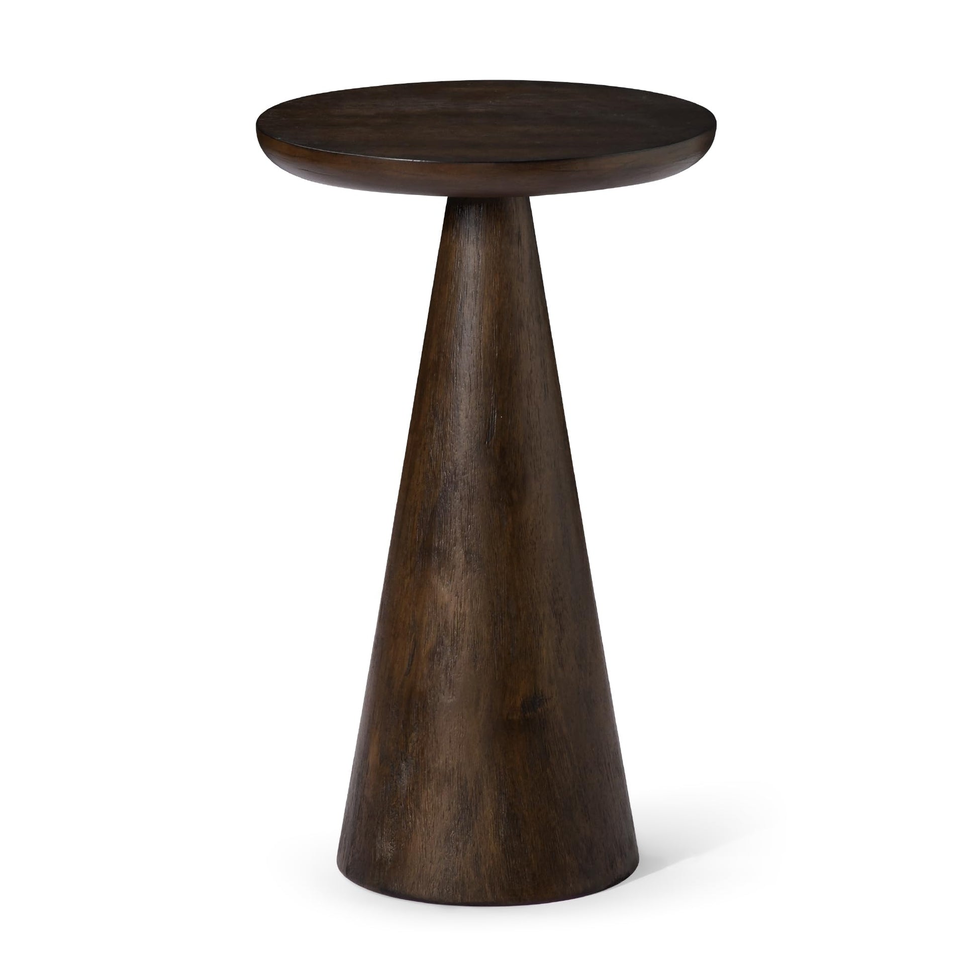 - ELEGANT AND PRACTICAL DESIGN: The Owen Drink Table in aged brown marries form and function beautifully. Its perfectly sized 12" round top and 20" height are perfect for small spaces, while the cone-shaped base adds a contemporary touch. Crafted from durable rubberwood with a wire-brushed oak veneer, this table features a warm aged brown finish that brings richness and character to any room, effortlessly complementing decor styles from rustic farmhouse to modern industrial.