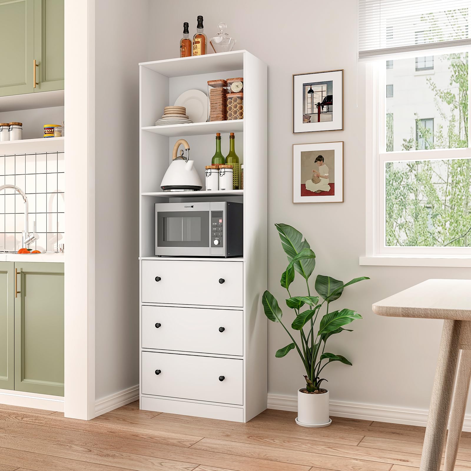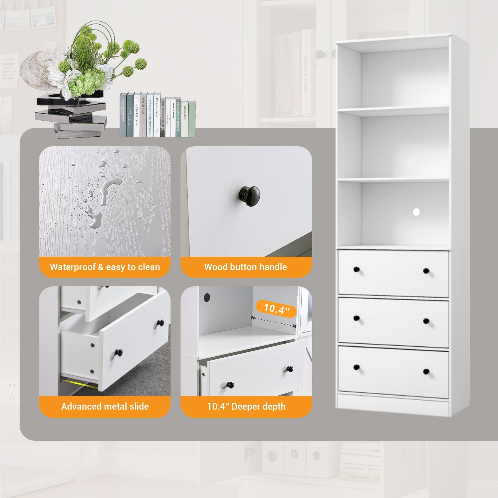 MECHYIN Bookcase and Bookshelf with Drawer, 71" Wooden Tall Storage Cabinet, Bookcase with 3 Drawers and 3-Tier Open Shelves, Home Decor Furniture for Living Room, Bedroom, Kitchen, Home Office, White