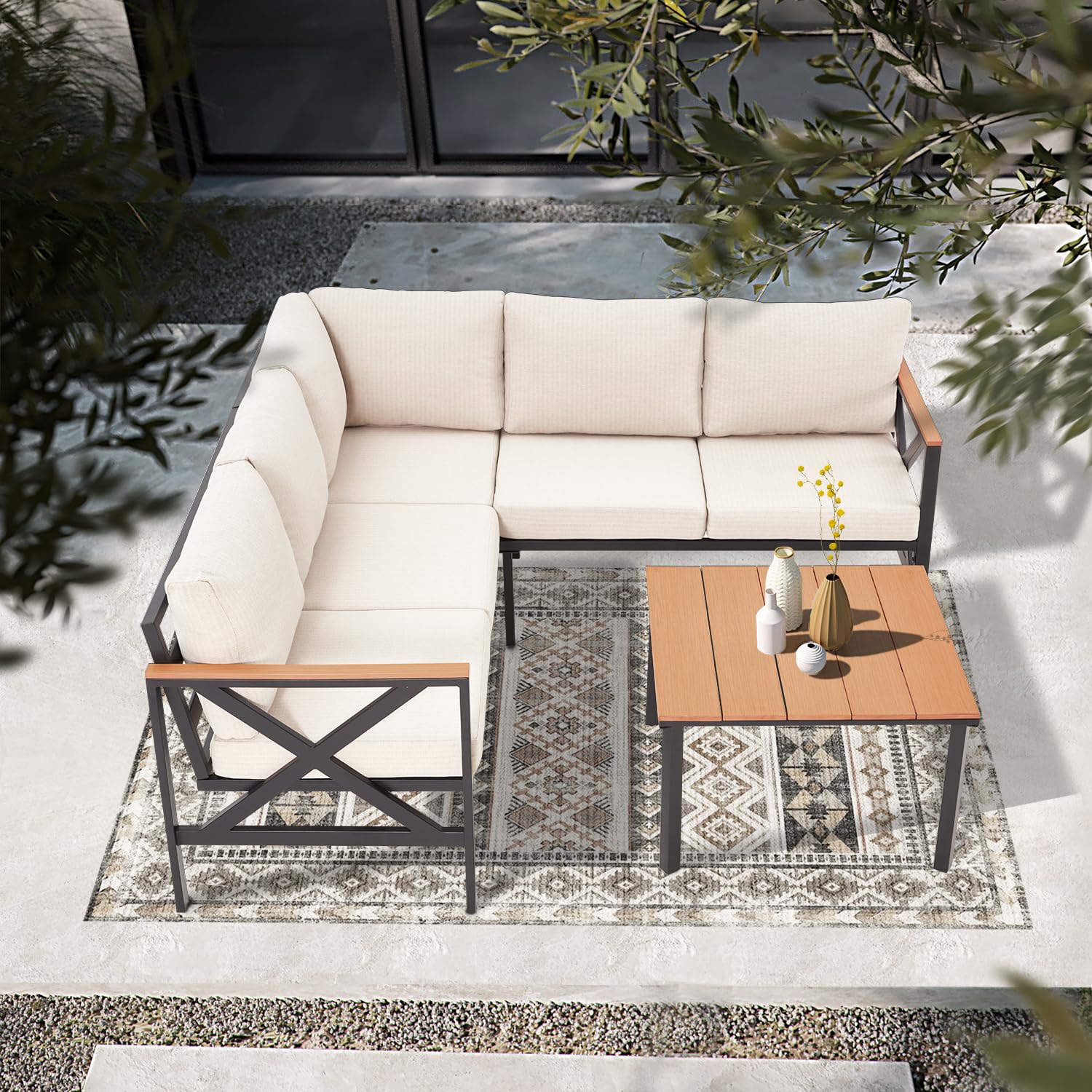 - L-shaped Couch & Modern X-Design: Our L-shaped sectional couch + 28" coffee table turns tiny balconies into chic hangouts, fit for 6 adults. X-shaped design and sleek matte black finish screams modern chic and add stability. L-shaped metal outdoor patio deals are the best decoration for backyards, balconies, gardens, terraces, and homes