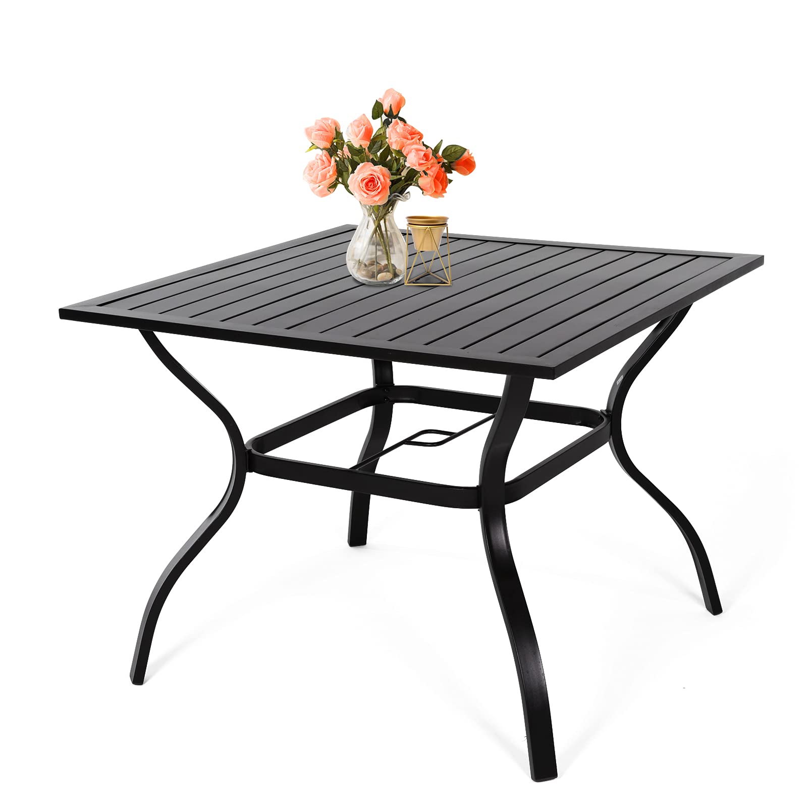 - Stylish Design: Stylish Design slatted metal tabletop makes it a fantastic addition to your porch garden ,backyard .It provides comfortable dining and chatting environment; Outdoor Patio Dining Table Size: L 37" x W 37" x H 28"; Diameter of umbrella hole:1.57"