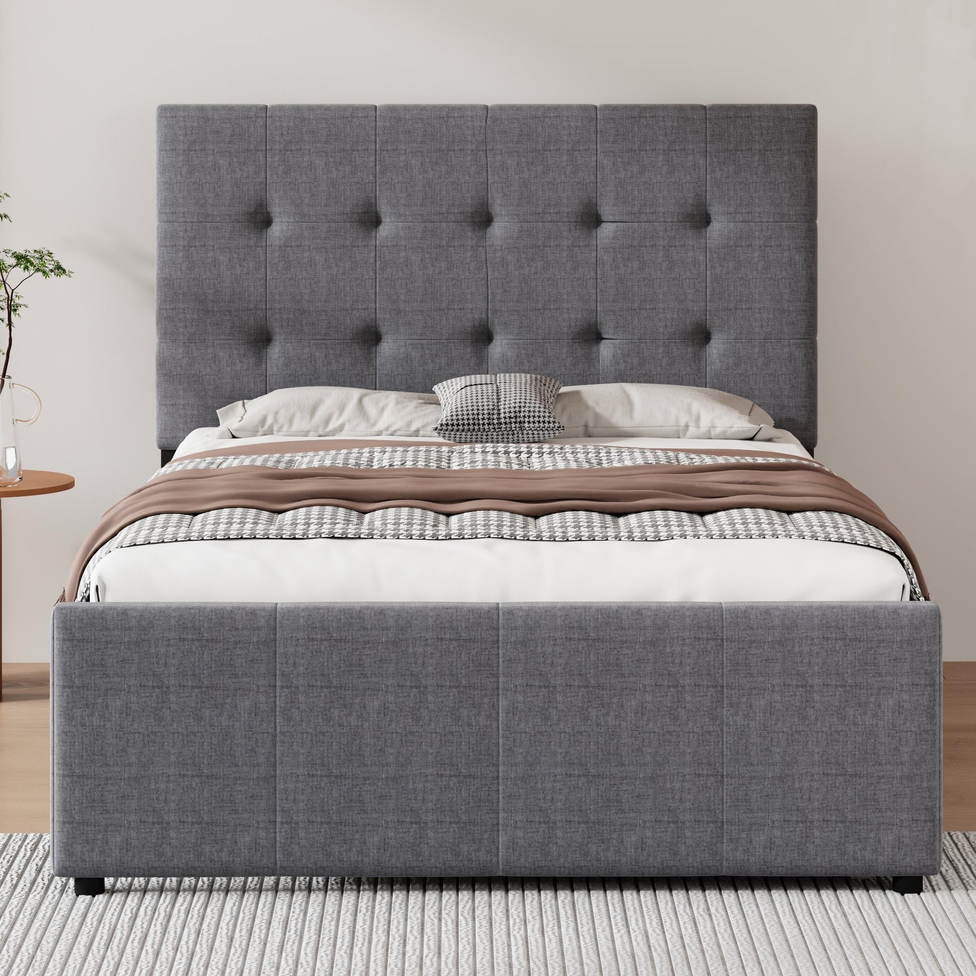 Upholstered Platform Bed, Linen Bed with Headboard and Trundle, Full, Grey