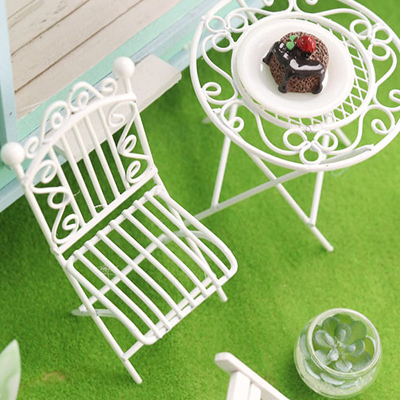 Metal Doll House Bistro Set, White Miniature Doll House Table and Chairs Set, 1/12 Scale Miniature Patio Set Fairy Garden Furniture Ornaments Micro Decor A