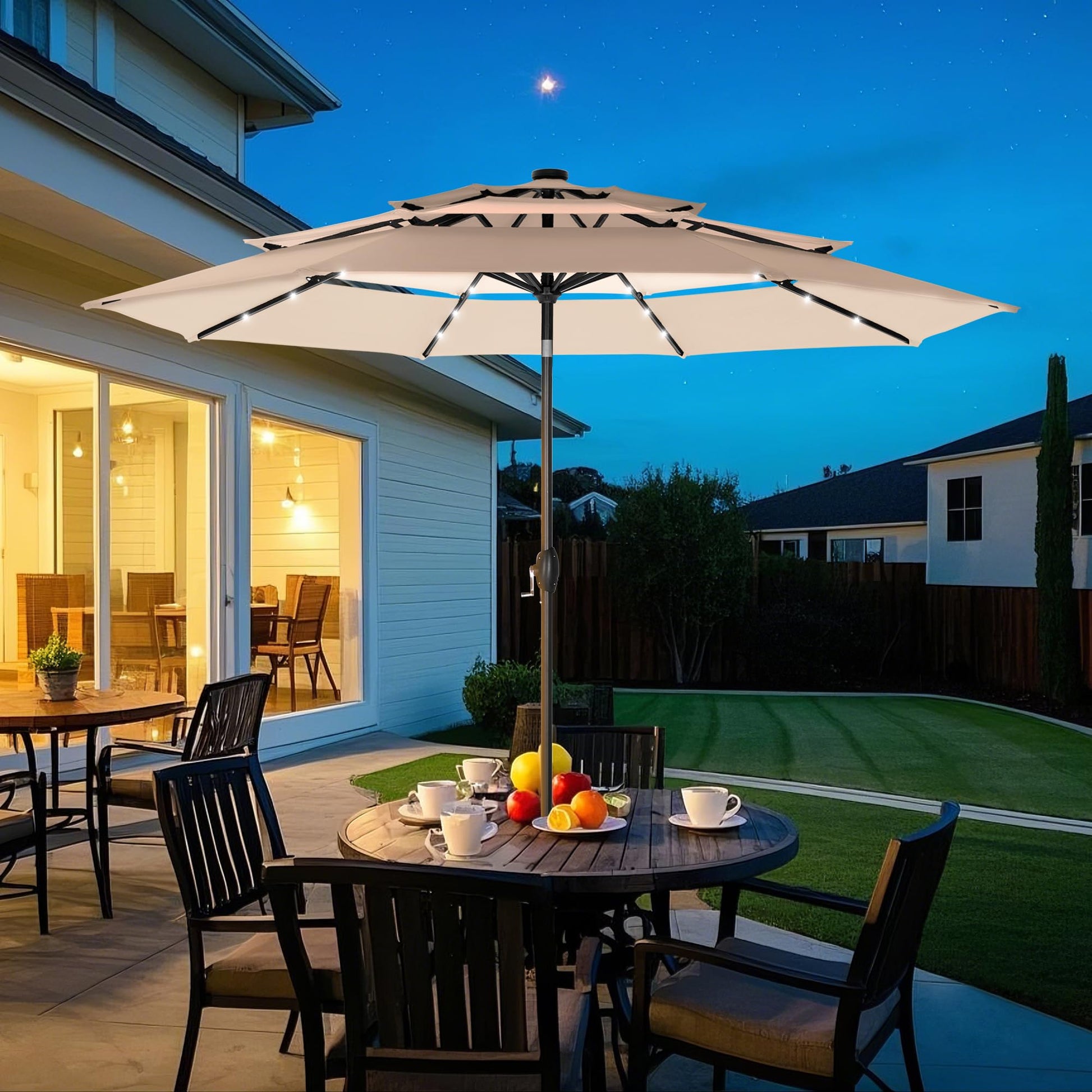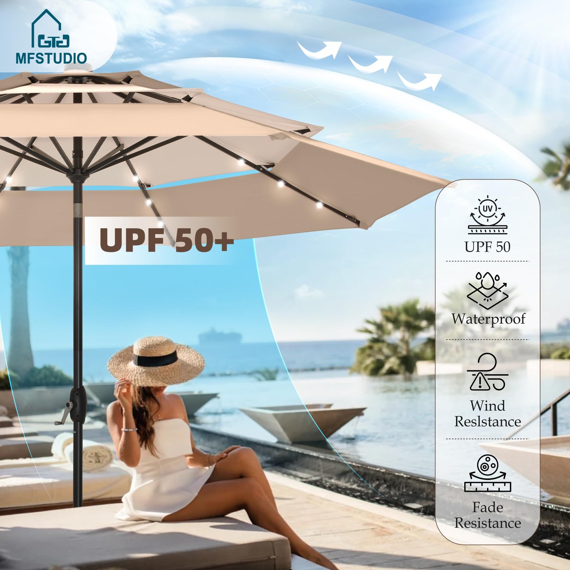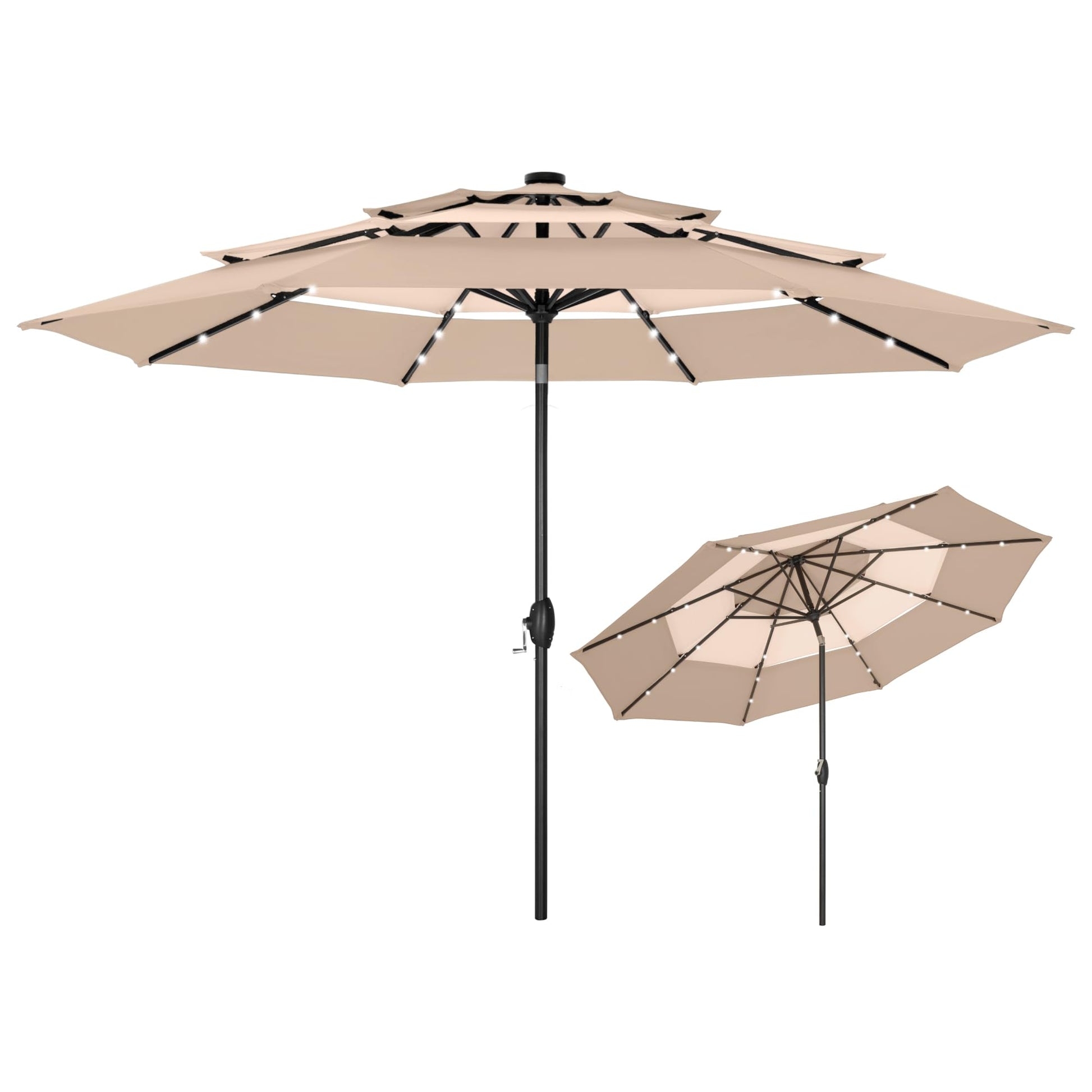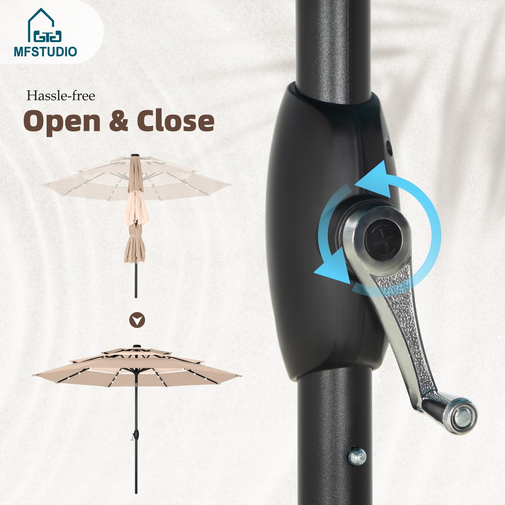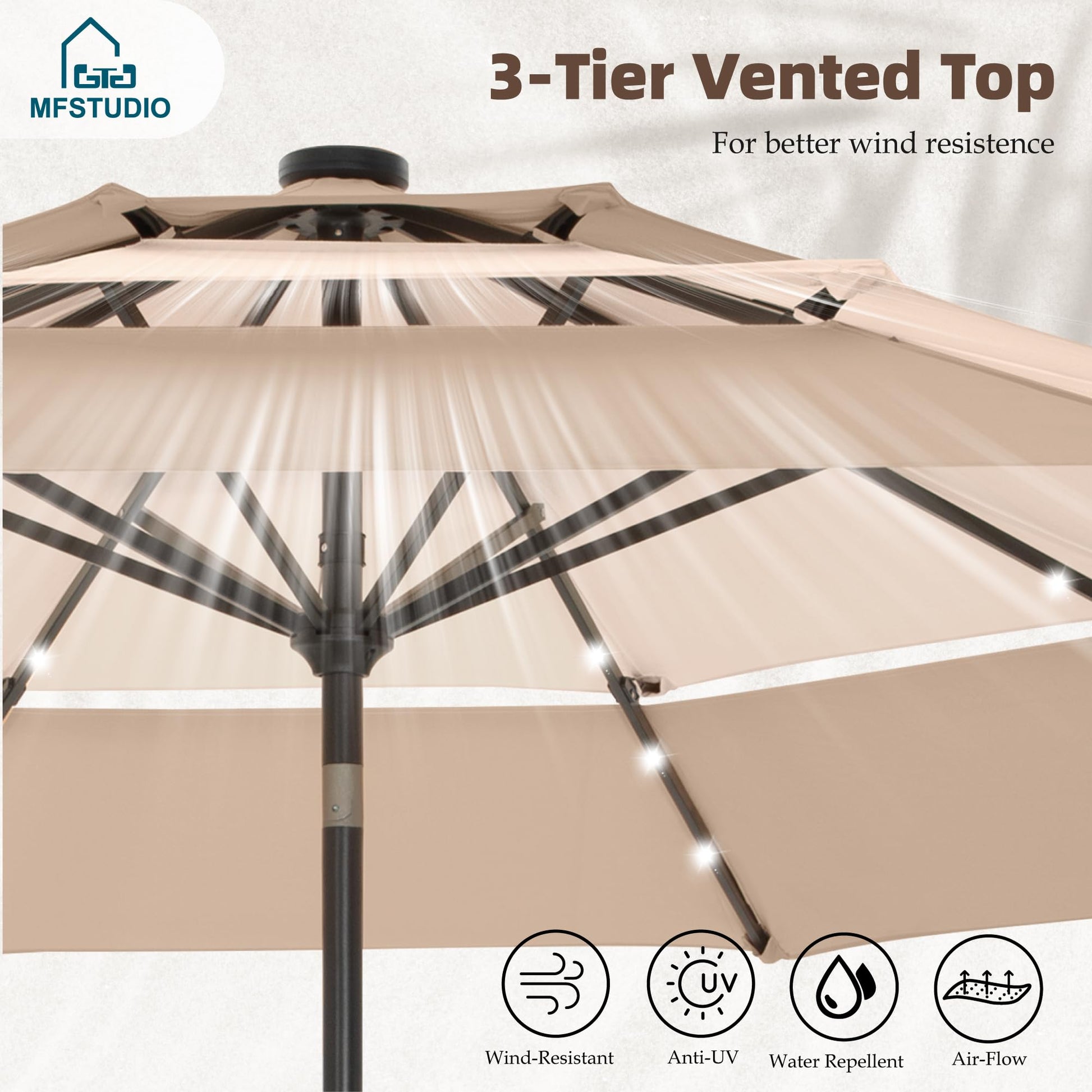 Open the MFSTUDIO 10ft 3-tier LED patio umbrella outdoor table umbrellas, enjoy outdoor scenery, cool breeze and talking with your friends under the umbrella. Specification: Color: Beige/Navy Blue/Orange Red/Blue & Green/Beigh & Khaki Size: 10ft x 8.2ft Fabric: 180g Polyester Fabric Pole: Metal, 1.5" Dia(38mm) Rib: 8 Metal Ribs Feature: 24 LED Lights Auto-tilt Design 1.5" Umbrella Pole 1.5 inch wide of the main pole enable a long-lasting use. Crank Open & Close With the crank sytem, you can easily raise and lower the canopy.