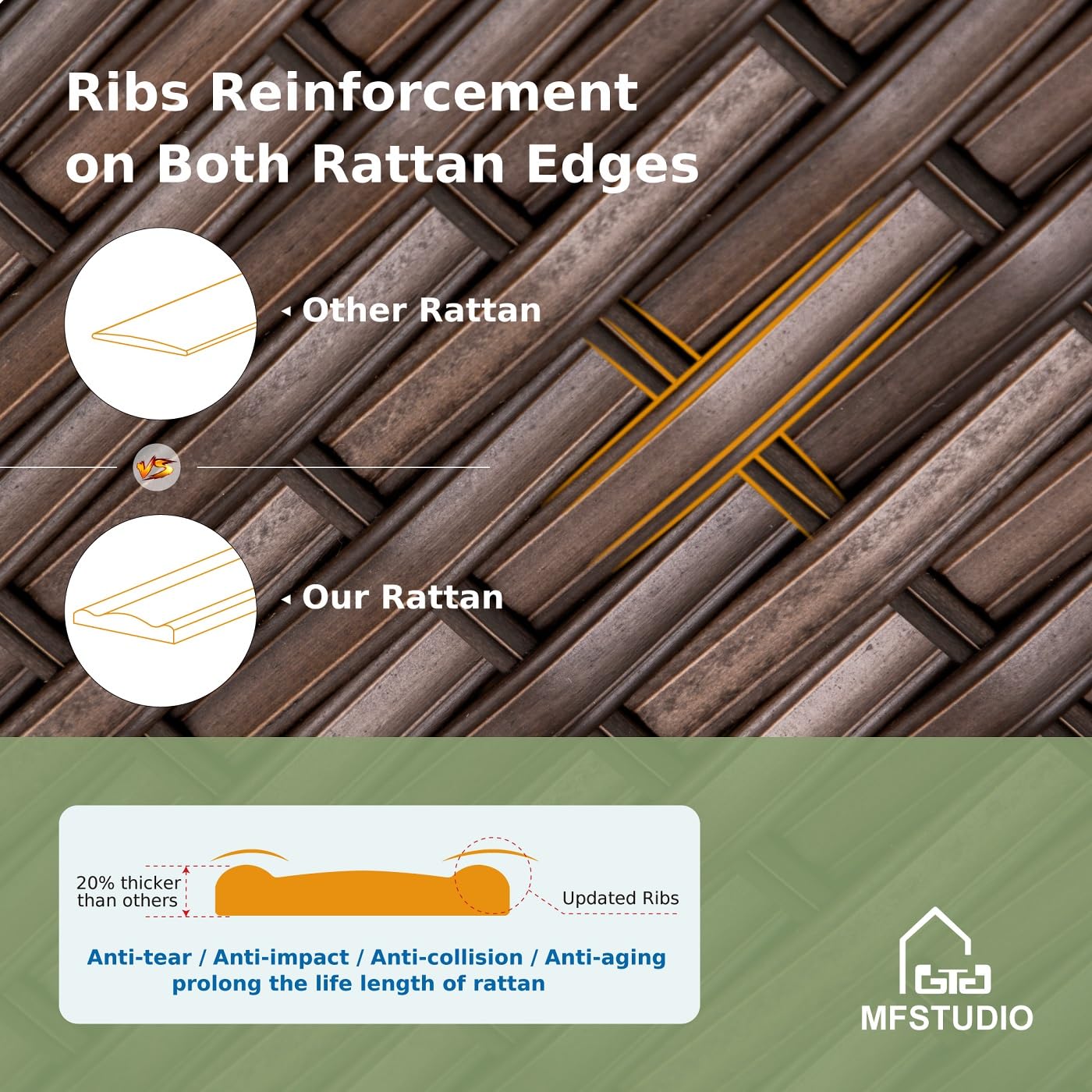 - Durable Rattan & Sturdy Frame: The patio conversation set is made of high-quality handwoven pe rattan. Additional reinforced ribs on both rattan edges make it more durable and suitable for different weather. Constructed with a sturdy metal frame, can effectively improve weight capacity. Special natural wood-like handrails and sofa legs provide excellent support and ensure long-term use.