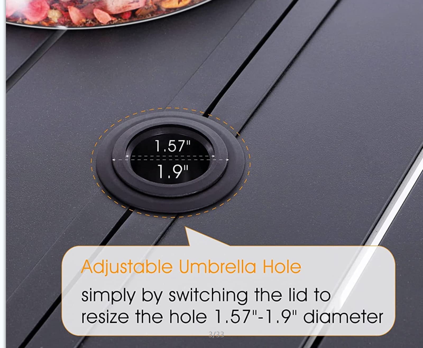 - Adjustable Umbrella Pole: An umbrella hole in the tabletop for installing a patio umbrella, fits up 1.57"- 1.9" inch diameter umbrella pole, and if outdoor long time use we recommended to use a weighted base