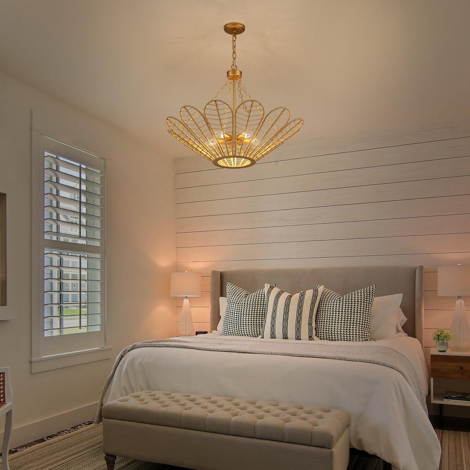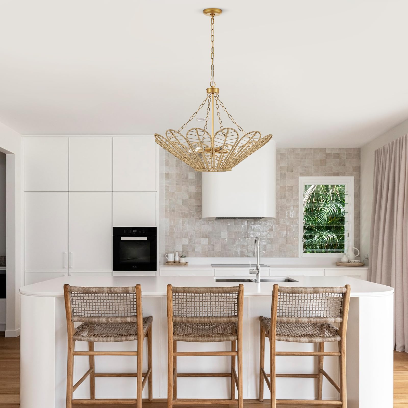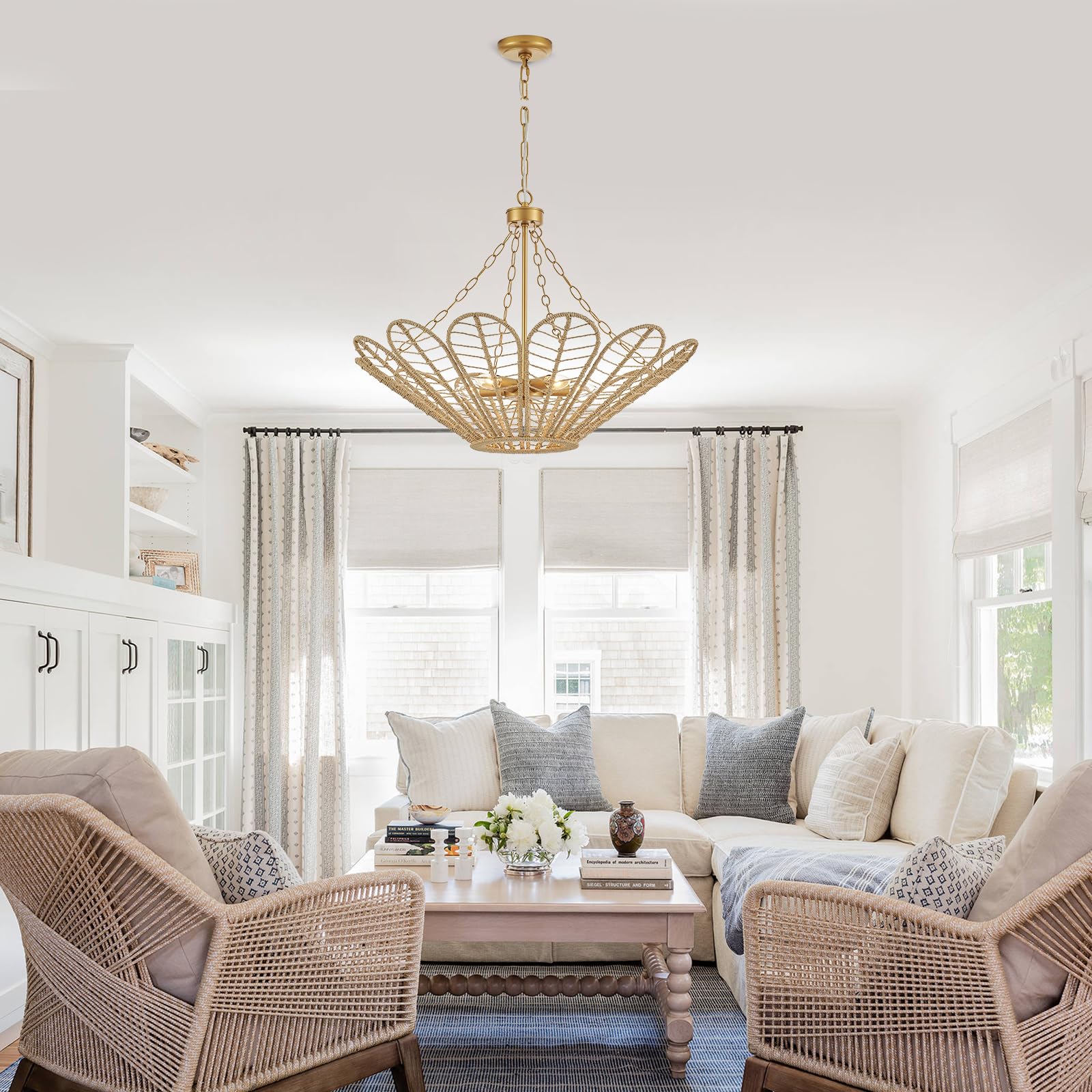 29" Natural Rattan Chandelier, with Boho Woven Wicker Flower Shade Antique Brass