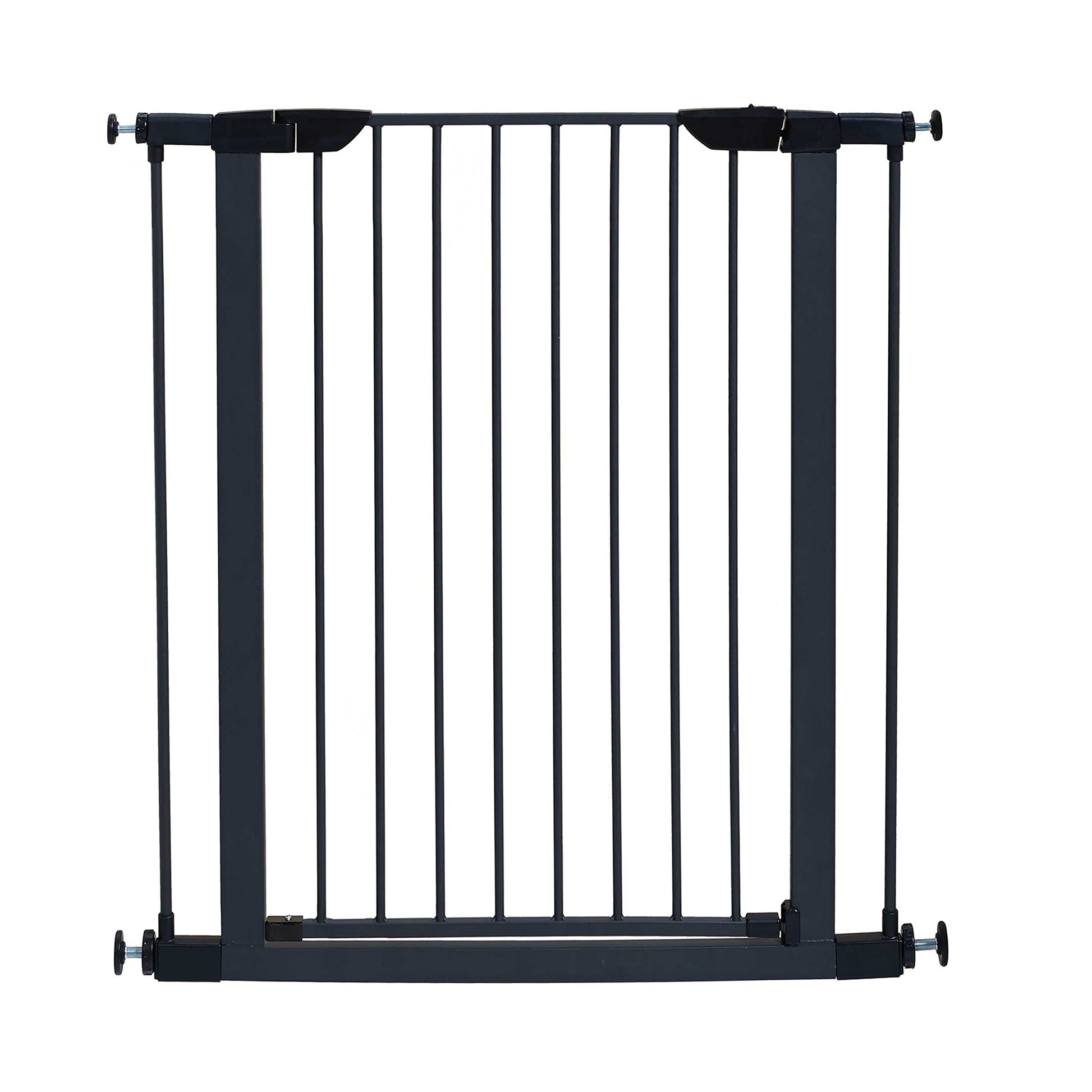 - Pet gate in textured graphite measures 39.125 high inches & expands from 29.5 - 38 inches wide, pet gate includes two additional 3 inch extensions.Closure Type:Latch