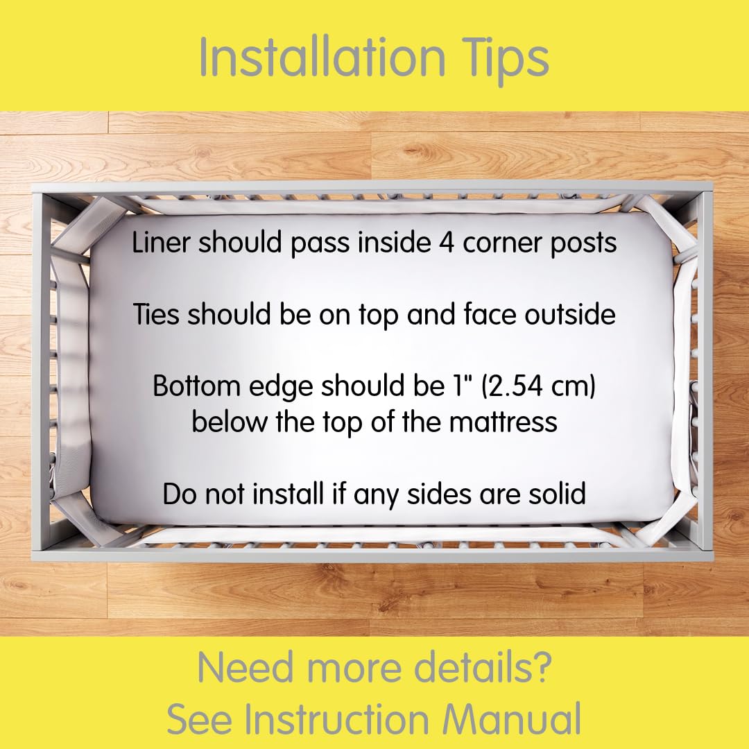 - EASY TO INSTALL: Liner should weave inside 4 corner posts and around interior of crib. Ties should be on top and face outside. Should not sag/appear loose. For help, see instruction manual and installation video or contact customer care for assistance.