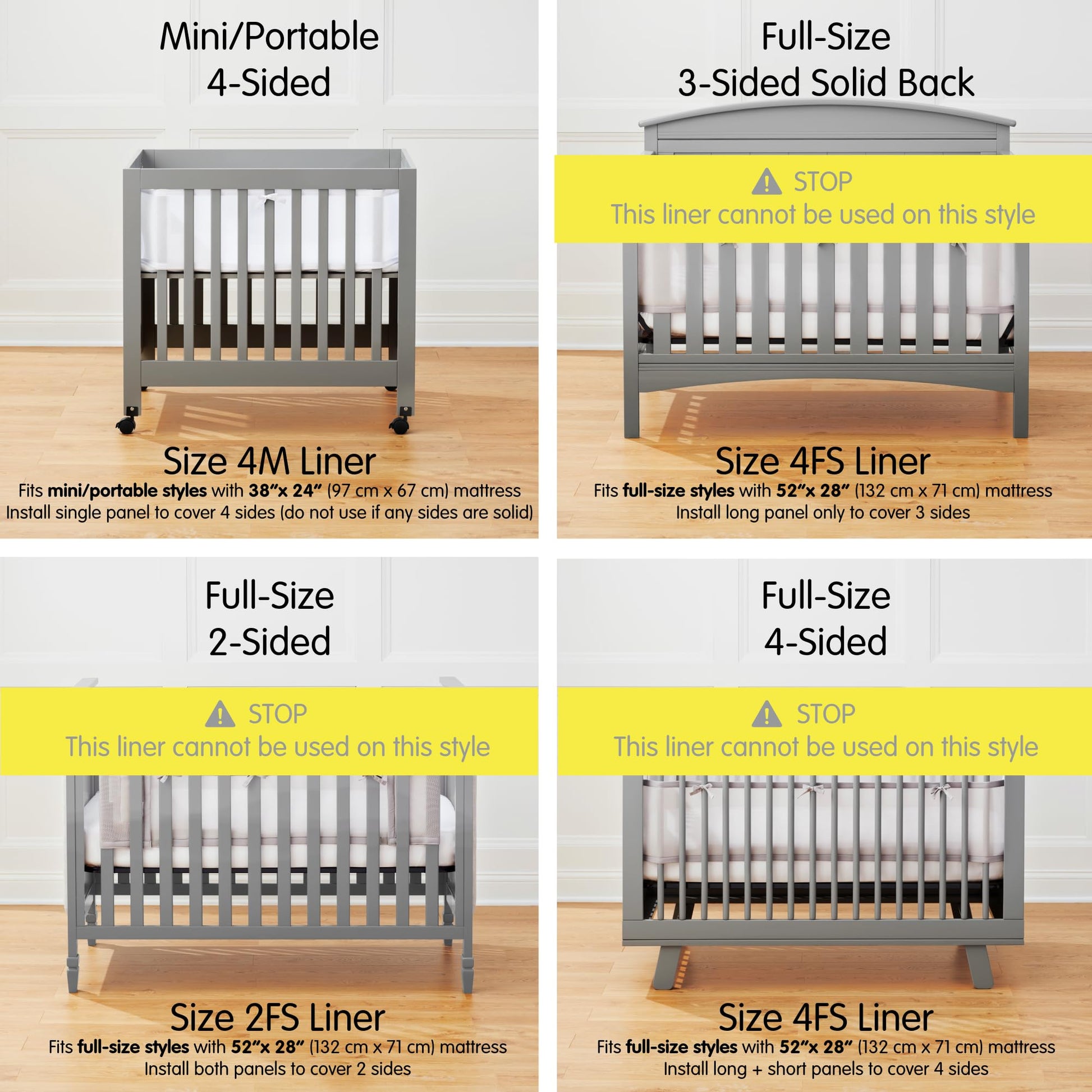 - MINI CRIB MATTRESS MUST BE 38" x 24" (97 CM x 61 CM) TO FIT: Install long panel 11" x 127" (28 cm x 323 cm) to cover 4 sides. Fit questions/help? Contact manufacturer. NOTE: NOT FOR FULL-SIZE CRIBS.