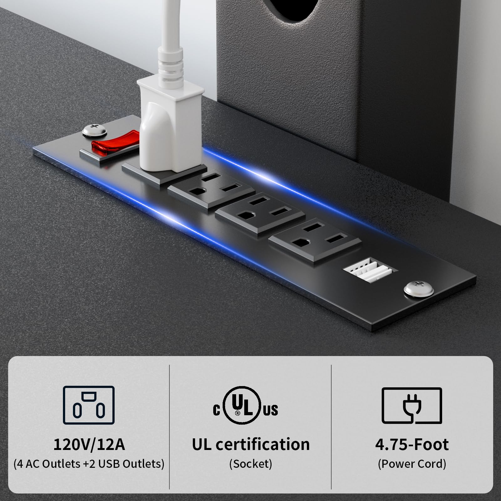 - This entertainment center is equipped with an integrated power strip containing 4 AC outlets and 2 USB outlets, offering convenience for charging your TV, gaming gear, and other electrical appliances. The TV mount also includes wire management to prevent cord tangling, streamlining the connection of all your devices.
