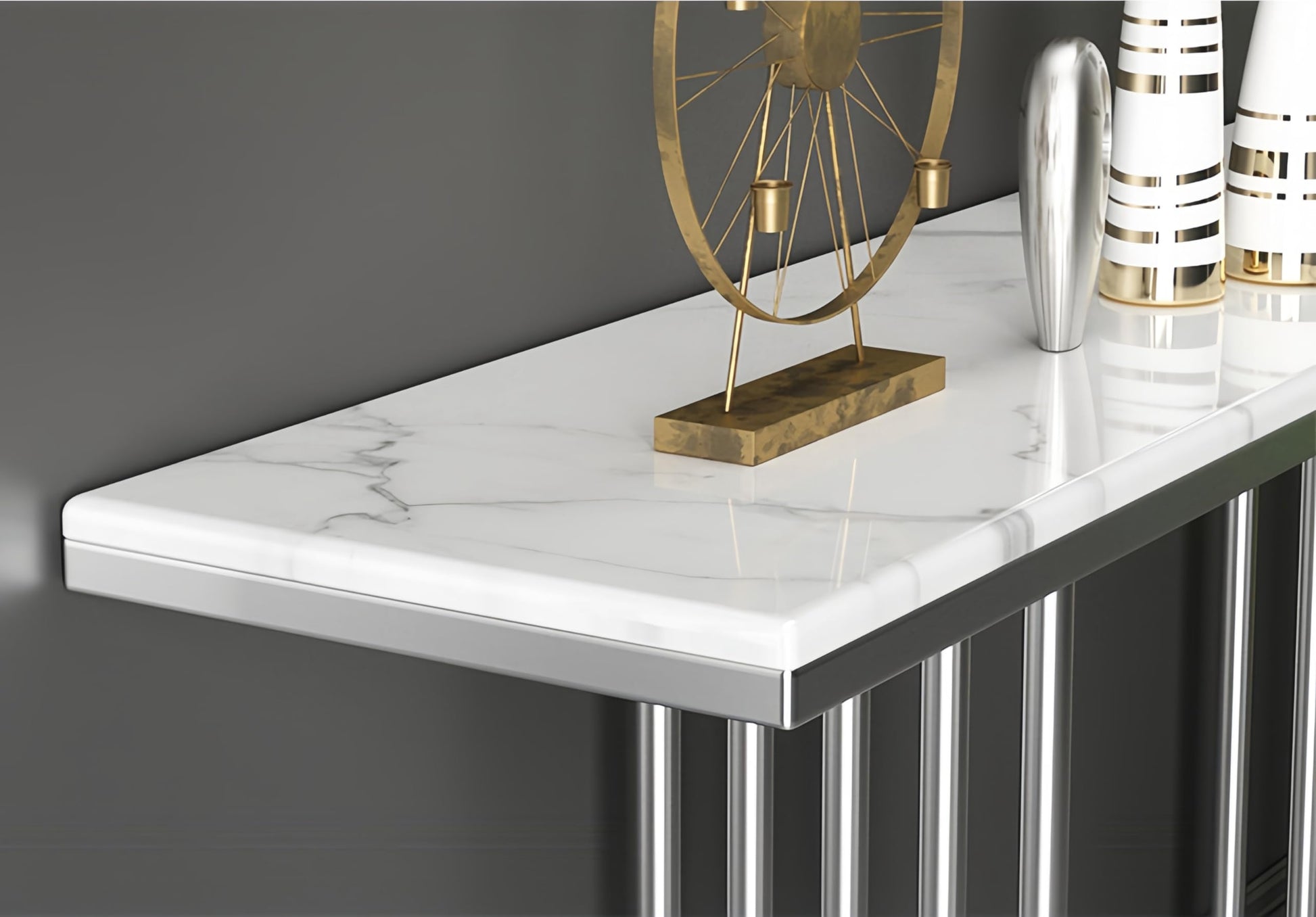 - This faux marble console table showcases an elegant metal frame and curved line accents that pair seamlessly with the clean tabletop for a luxurious modern glam look. With a striking geometric design for a touch of impeccable style, this table is sure to enliven any space. From the foyer to the living room and beyond, the Entry Table provides space to display decorative pieces while eliminating clutter.