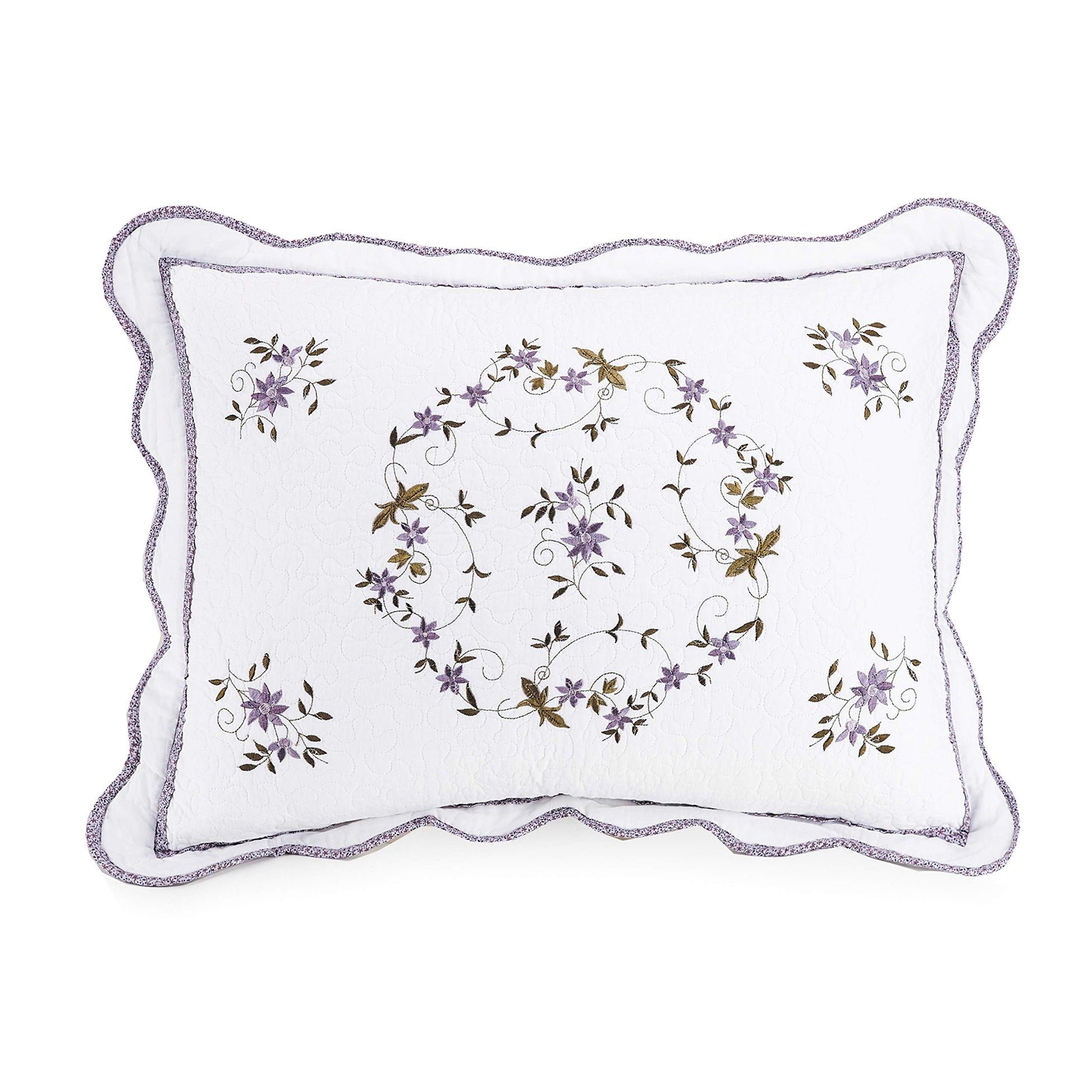 - Bring home a taste of the country with the Gwen quilt set. Embroidered with wreaths of lavender flowers with green leaves on a white ground. The binding is made of a lavender floral fabric that adds a touch of pattern to the soft scalloped edge. Vermicelli quilting adds a subtle allover pattern. 100% cotton face and fill with a brushed polyester backing.
