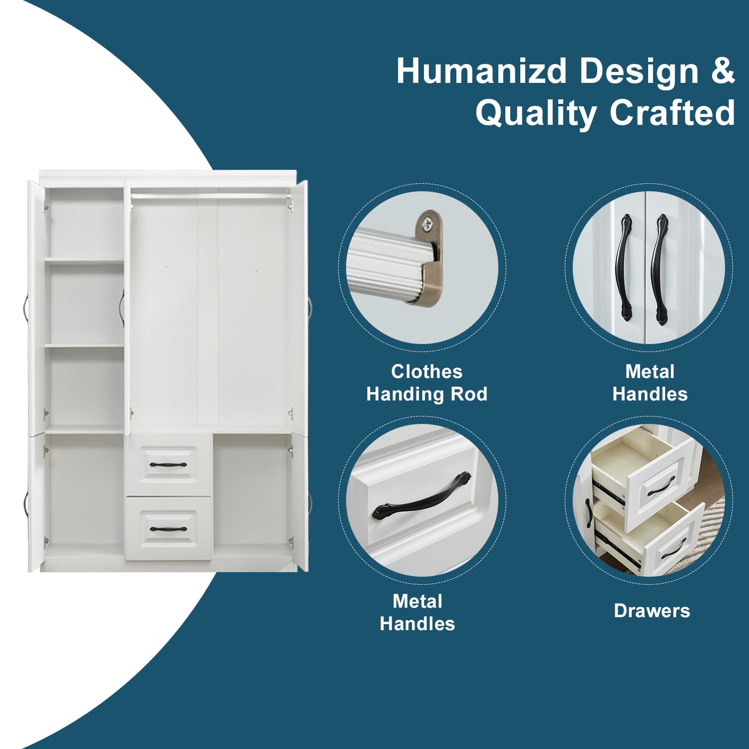 - The stylish design of the 3 door armoire with 2 drawers is in white color, add your bedroom with a classic and elegant charm. The application of classic design door panels adds a touch of unique fashion to the whole closet. The white color makes the space brighter, adding a freshness and comfort into your home. Not only provides ample storage space, but also adds a beautiful landscape to your home. Make your life more tasteful and exquisite.