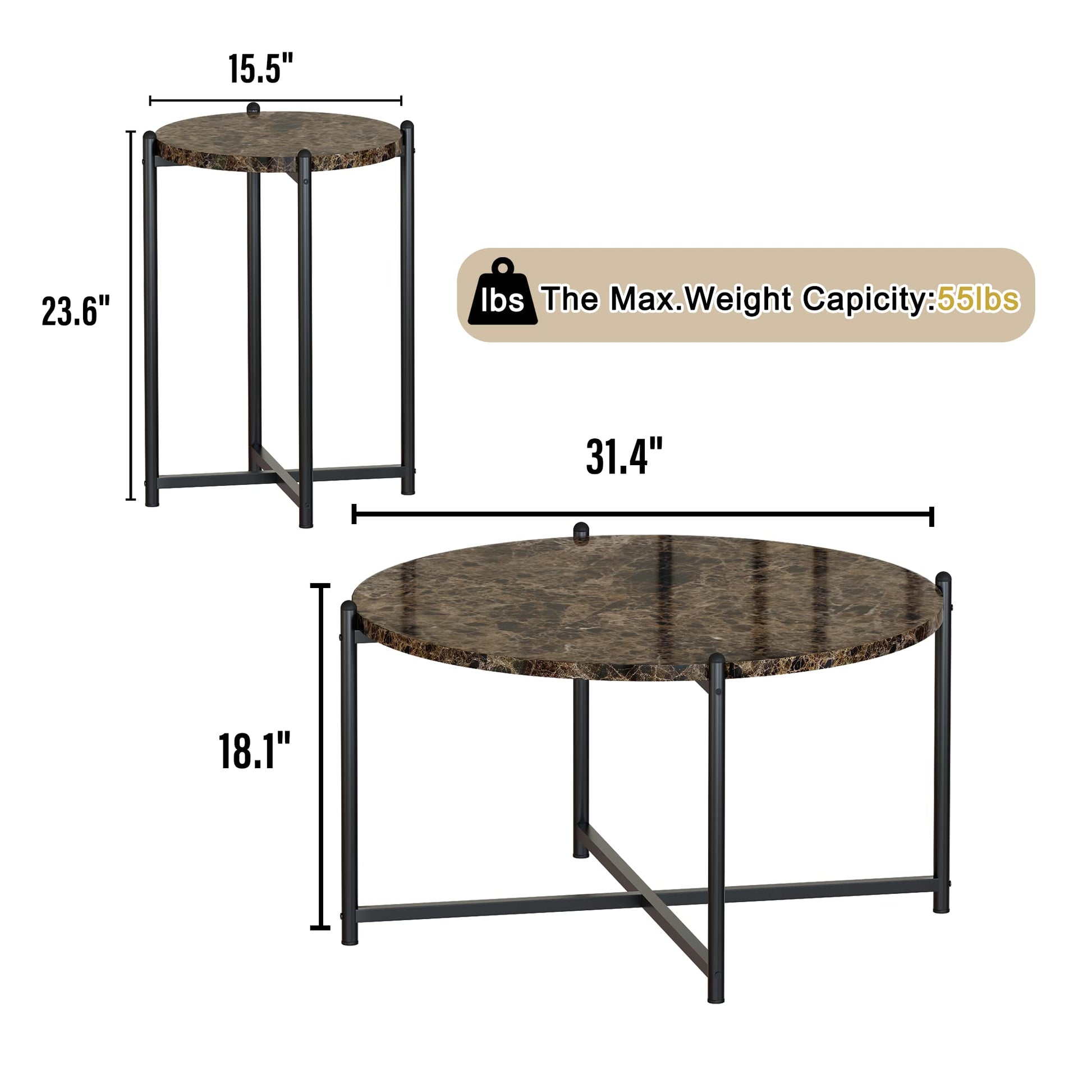 - The round coffee table is made of MDF tabletop and metal legs, stable and wear-resistant achieving both good looks and superior durability.This round coffee tables with a X base structure, which ensures stability. The coffee table weight limit is 65lbs, side table weight limit is 30lbs.