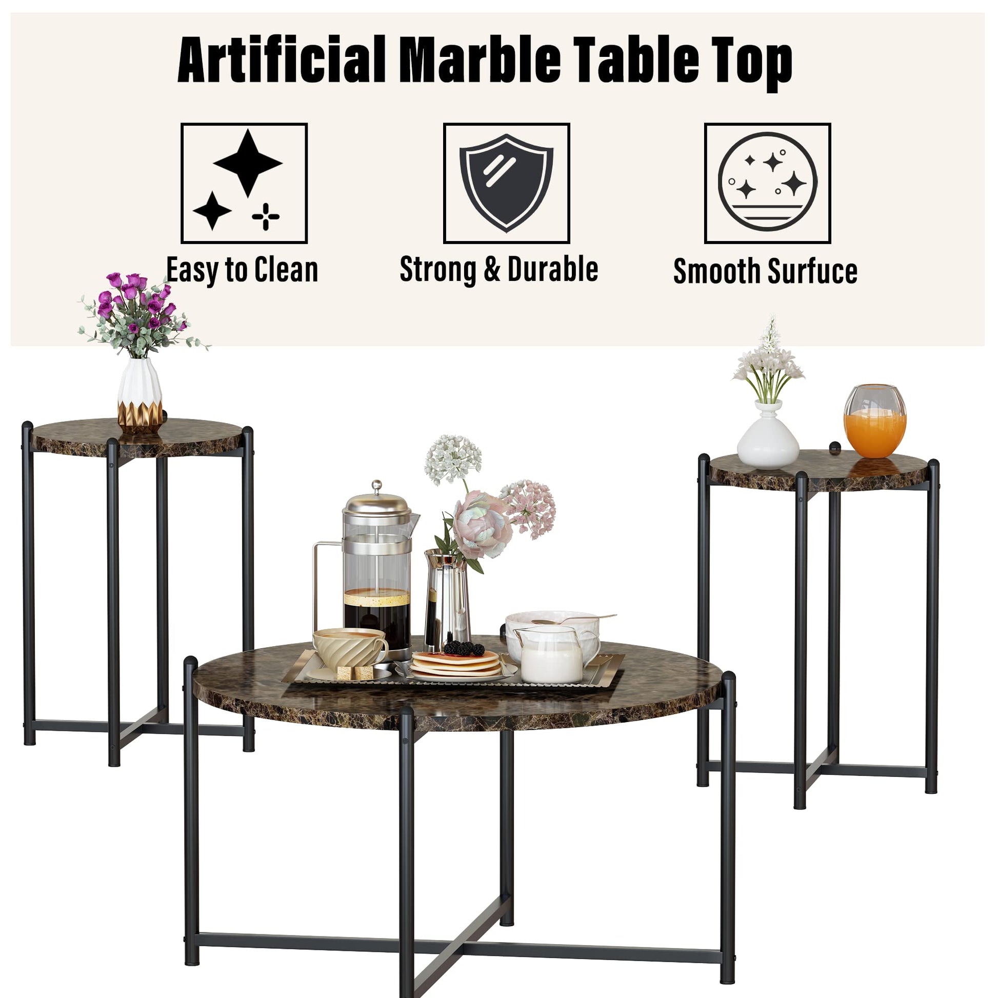 Coffee Table Set of 3, TableSet with Marble Tabletop and Metal Frame