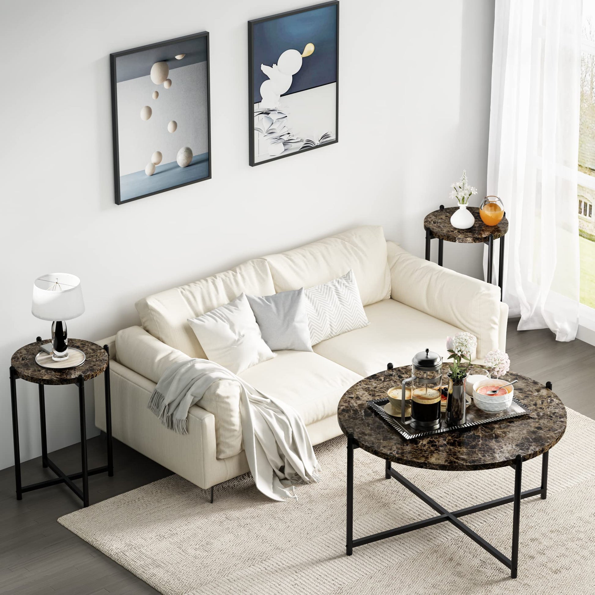 - This table set of 3 includes one coffee table and 2 end tables/side tables.Marble coffee table overall:31.49"(L) x 31.49"(W) x 18.11"(H); 2 sofa tables overall:15.51" W x 15.51" L x 23.62" H.