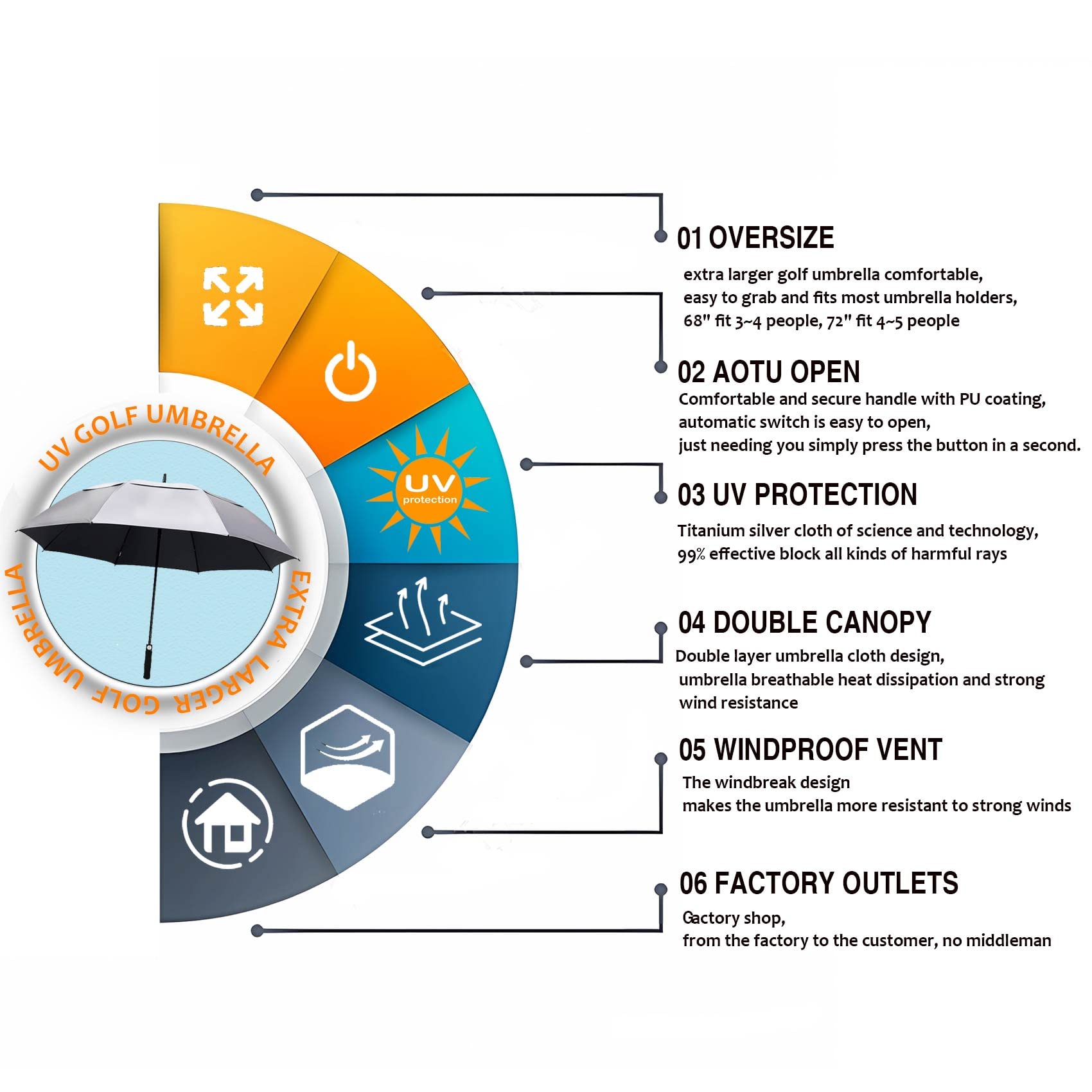68/72 Inch Automatic Open UV Golf Umbrella, Extra Large Oversize Double Canopy Vented Windproof Waterproof