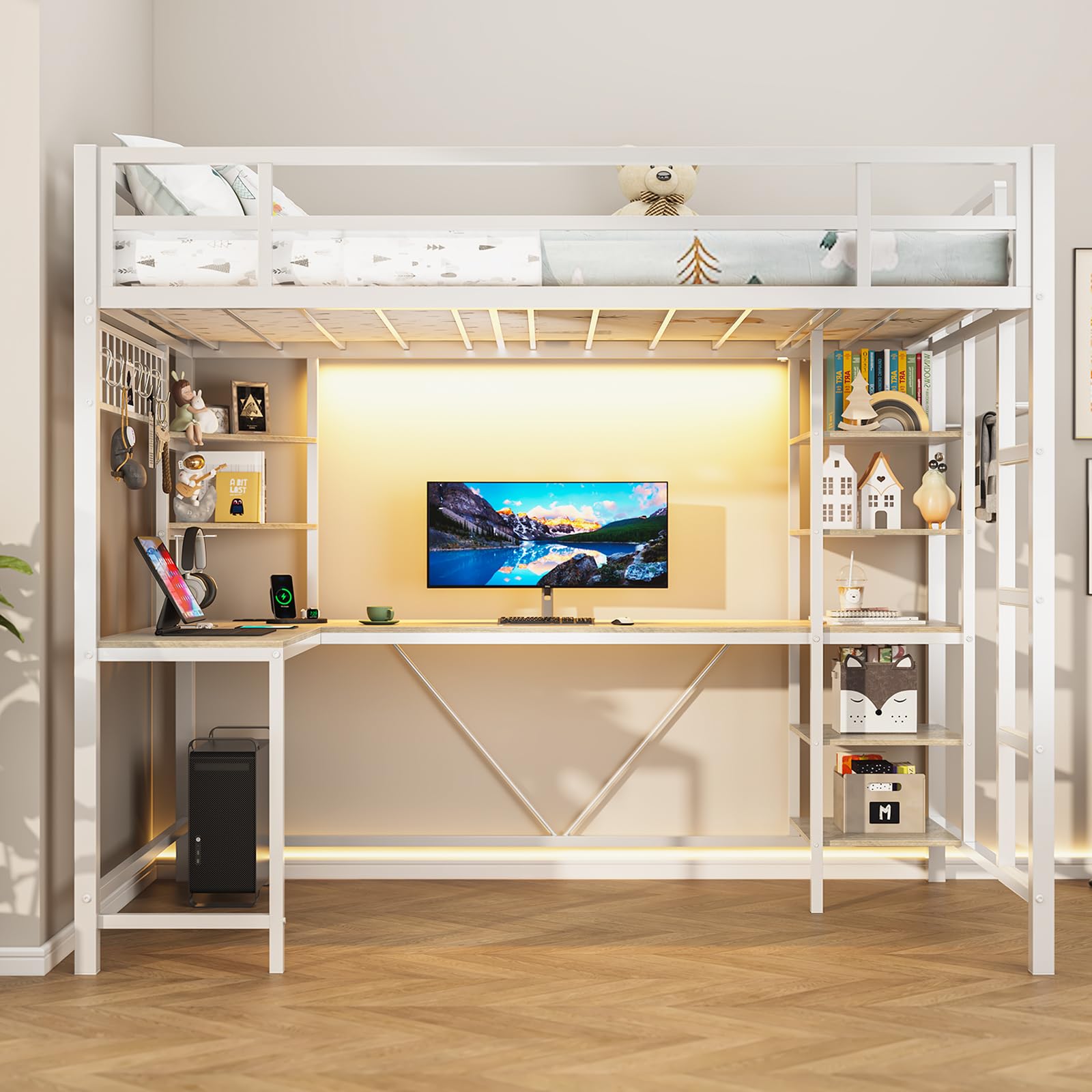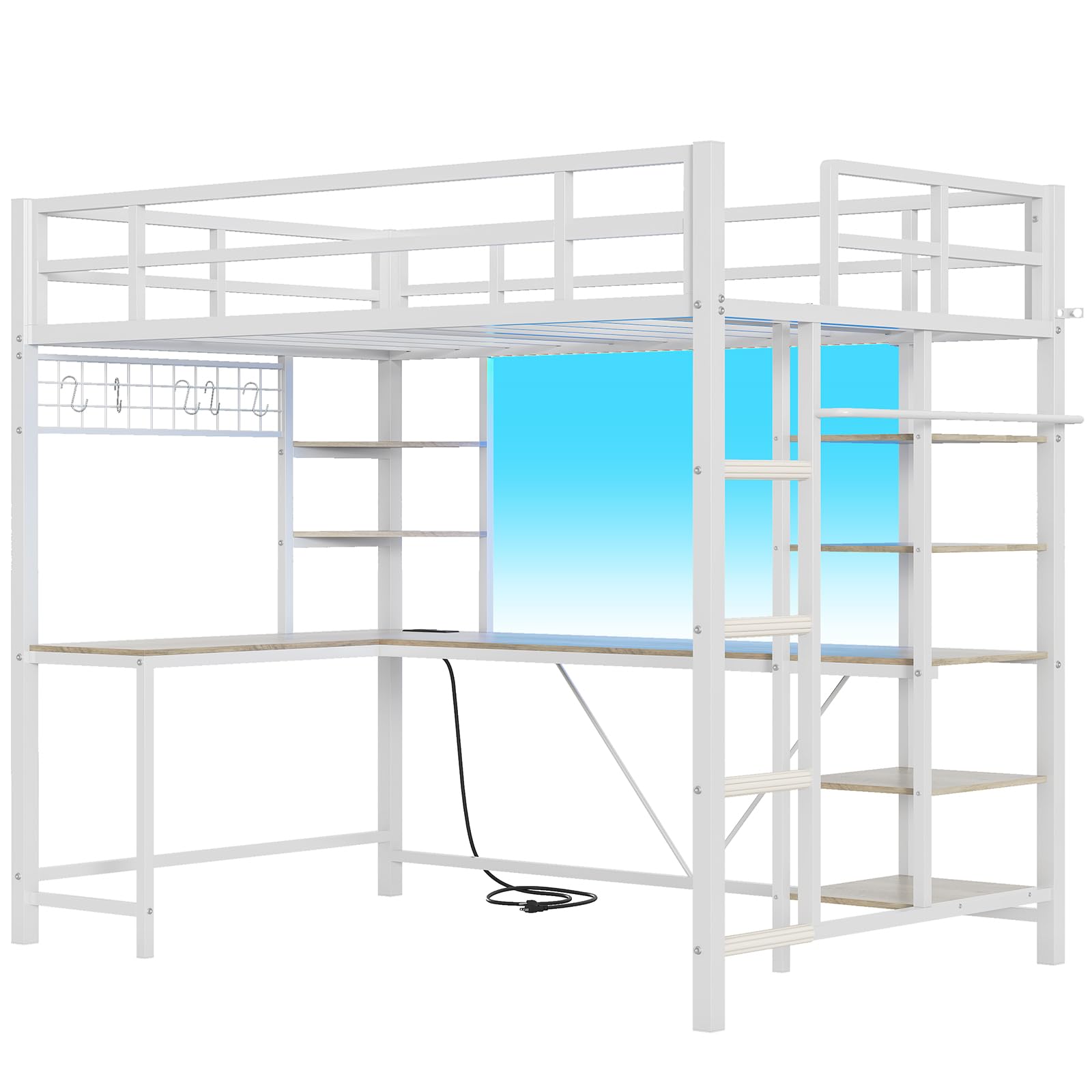 Bed Twin Size with L Shaped Desk, LED Lights, Charging Station, Heavy Duty Metal Loft Bed Frame with 6 Storage Shelves, Safety Guard & Ladder, No Box Spring Needed, No Noise, White