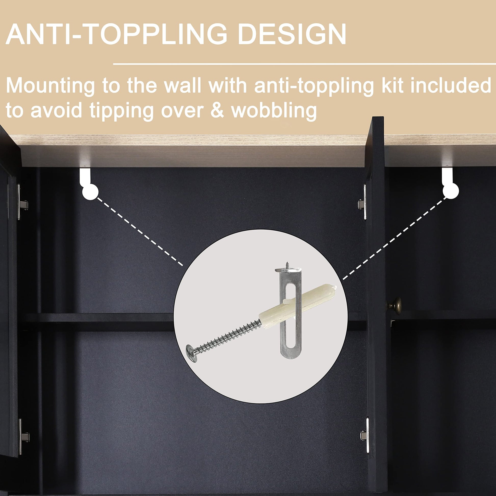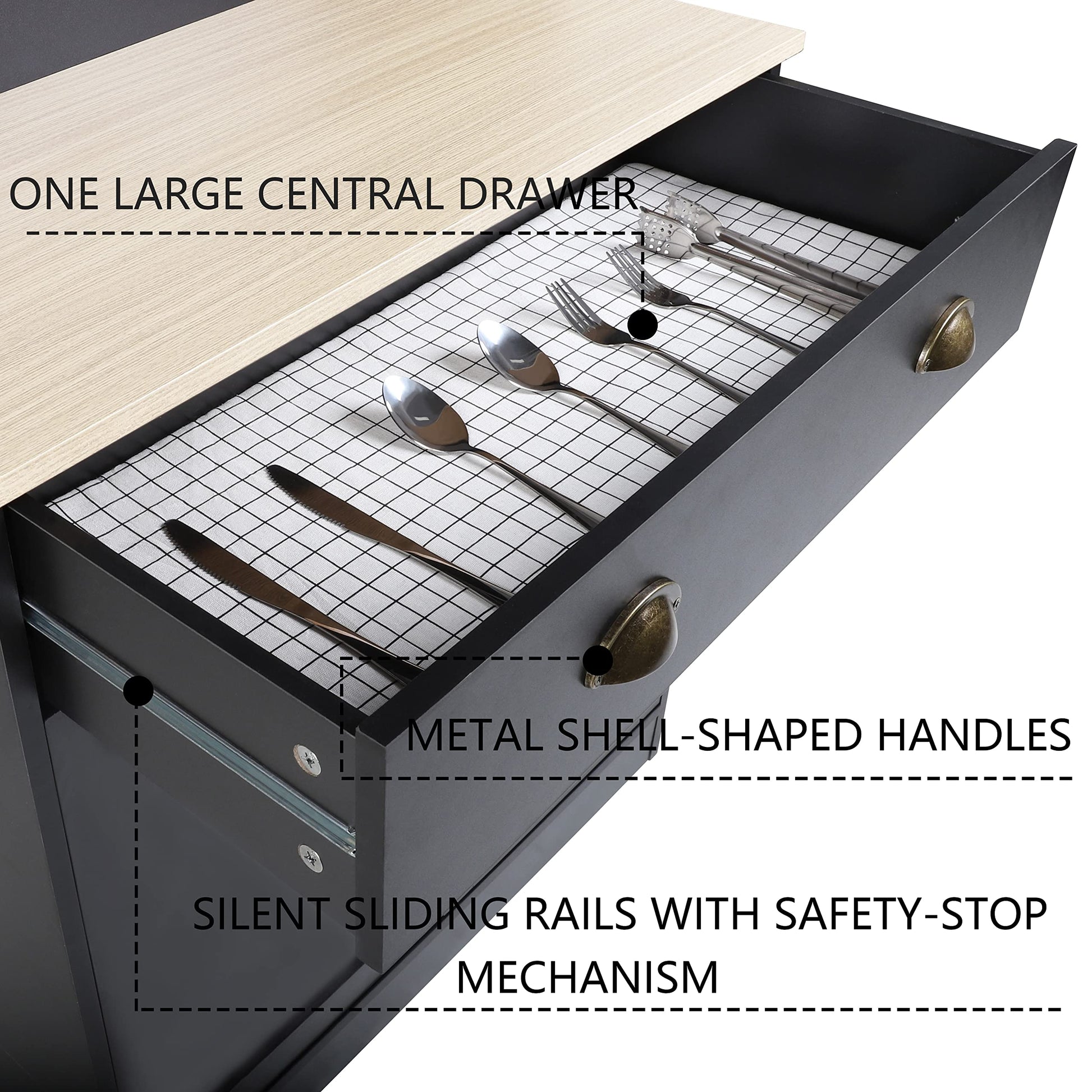 - Using the anti-toppling kit included to secure this kitchen pantry buffet hutch at back to the wall for safety concern. The reinforced structure with high-grade material would definitely provide you a safer using experience for better weight capacity. The large central drawer in the middle is designed to slide silently and smoothly with safety-stop mechanism so that you won’t pull it out fully. You can safely place tableware such as forks and knifes inside.