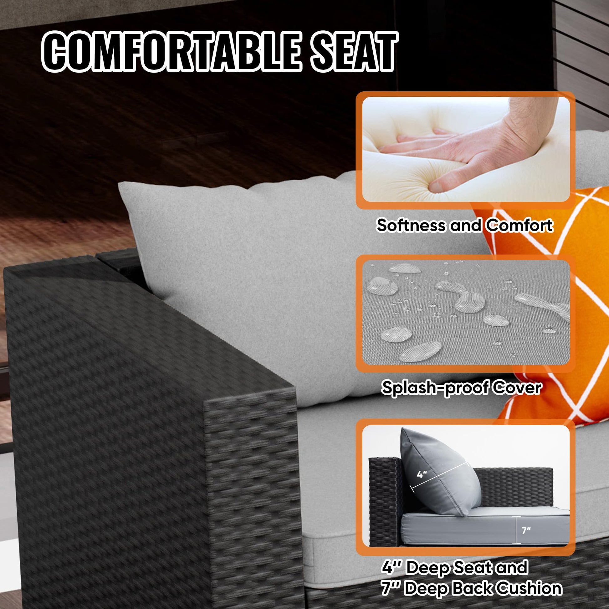 - Comfort & Non-slip The patio sofa is filled with a high-density sponge, which is soft and resilient offering unparalleled softness and comfort. The zippered cushion cover is fade-resistant, stain-resistant, and easy to clean. The removable glass table enhances bearing capacity and can be easily wiped down.