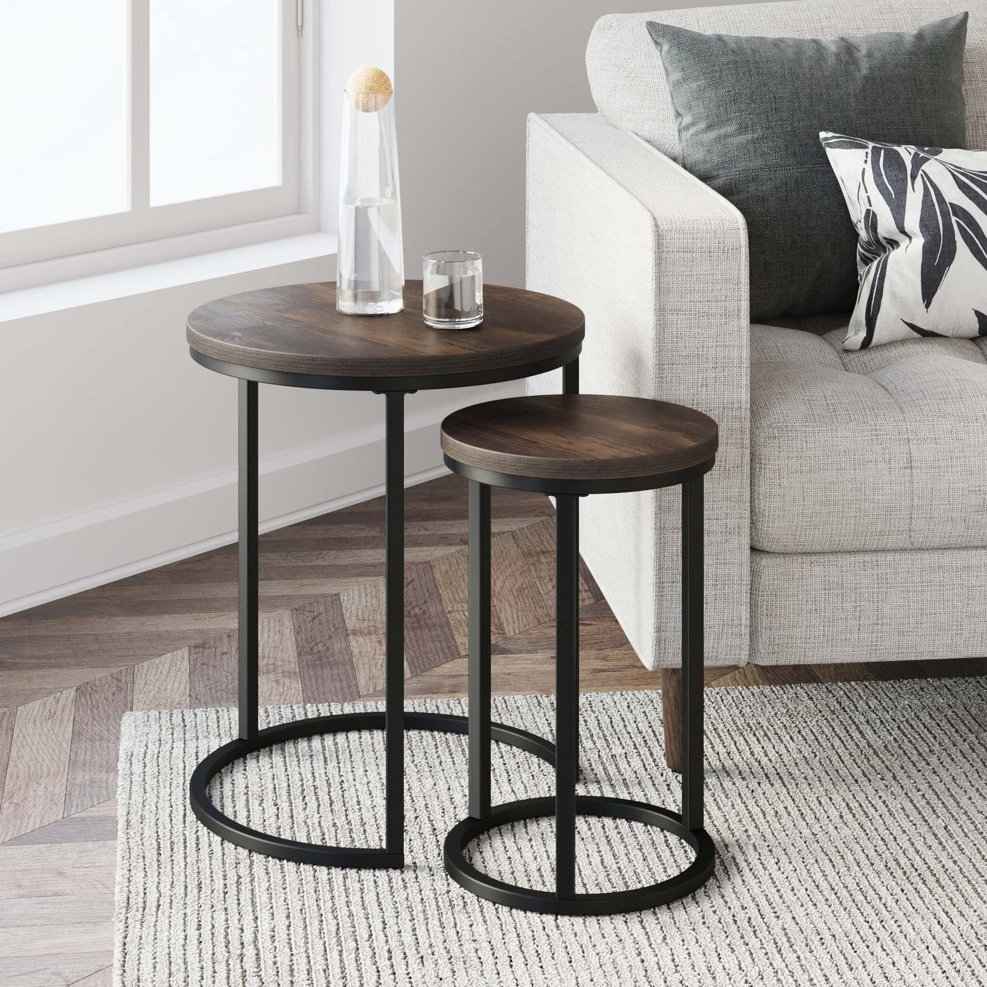 - The Lula sophisticated table features a thick nutmeg finish tabletop on both of the nesting tables which contrast perfectly with the powder-coated black metal legs. Use this set of 2 nested tables with a sturdy design to complement your living space and become an accent piece in your living room .Assembly Required. Material: Engineered Wood ;Paper Laminate; Metal