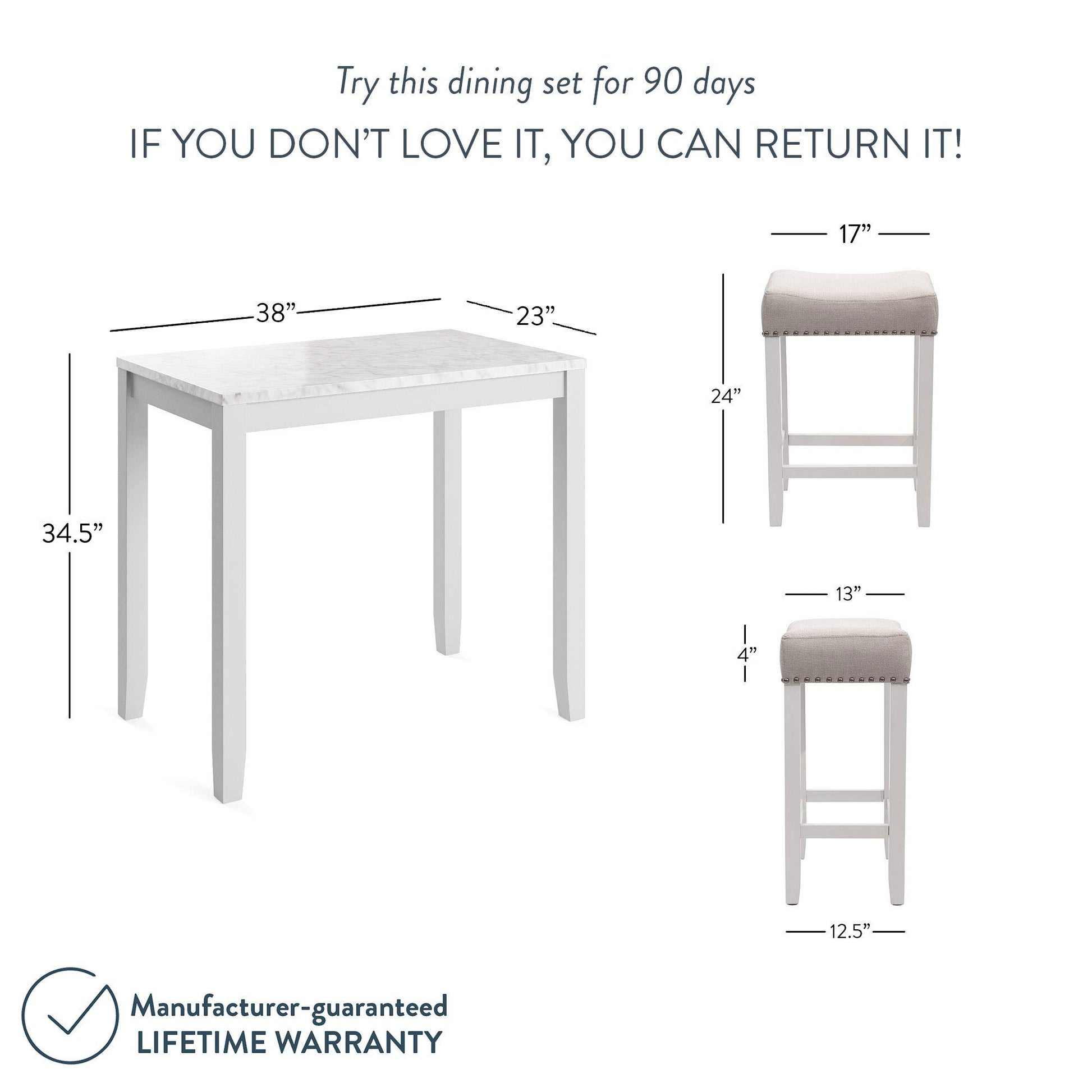 - Enjoy bistro dining with a marble-laminated table with two fabric stools.