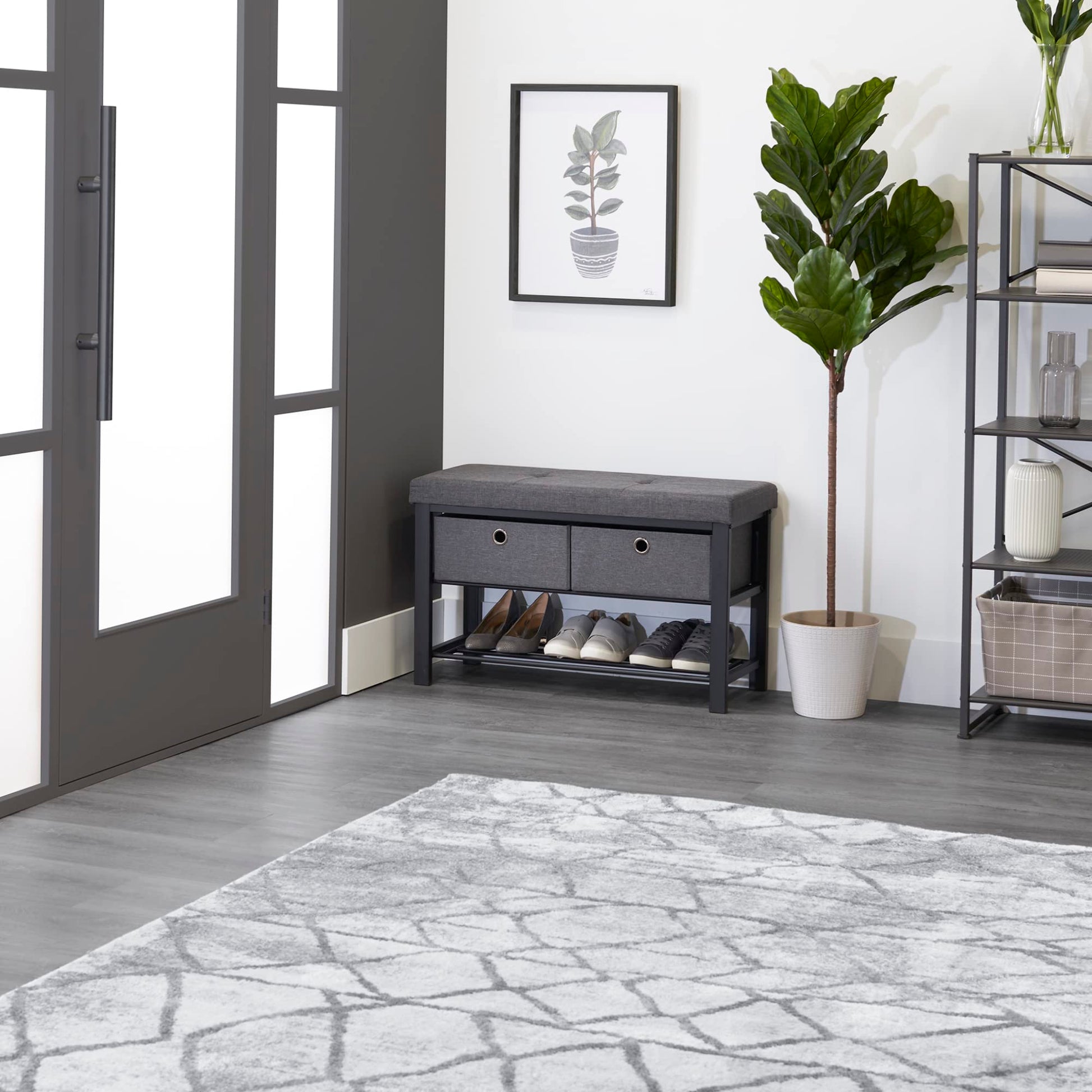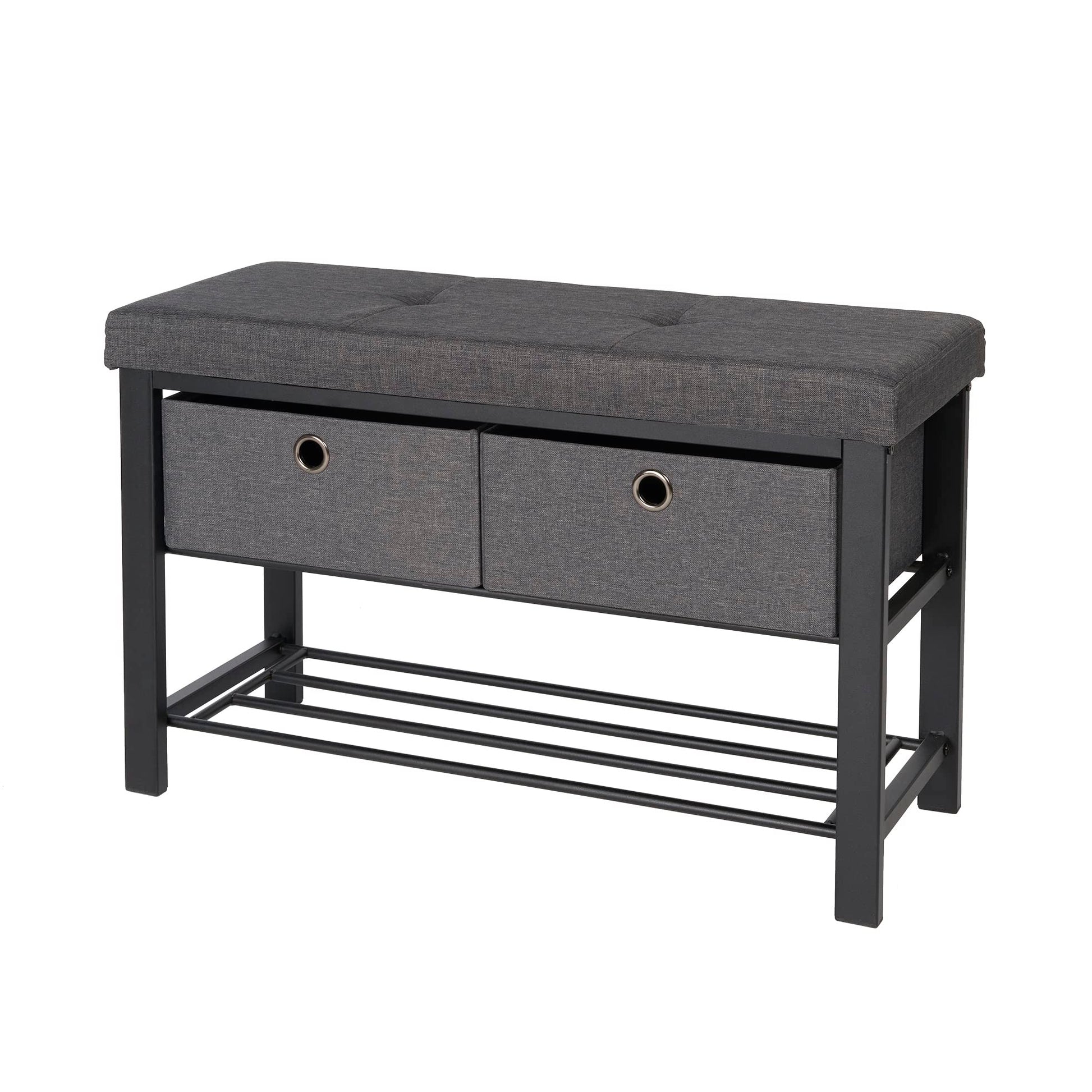 - CUSHIONED UPHOLSTERY The bench seat cushion is upholstered in charcoal fabric and features a padded interior for additional comfort. Take a seat on the padded seat and remove or put on your shoes with ease.