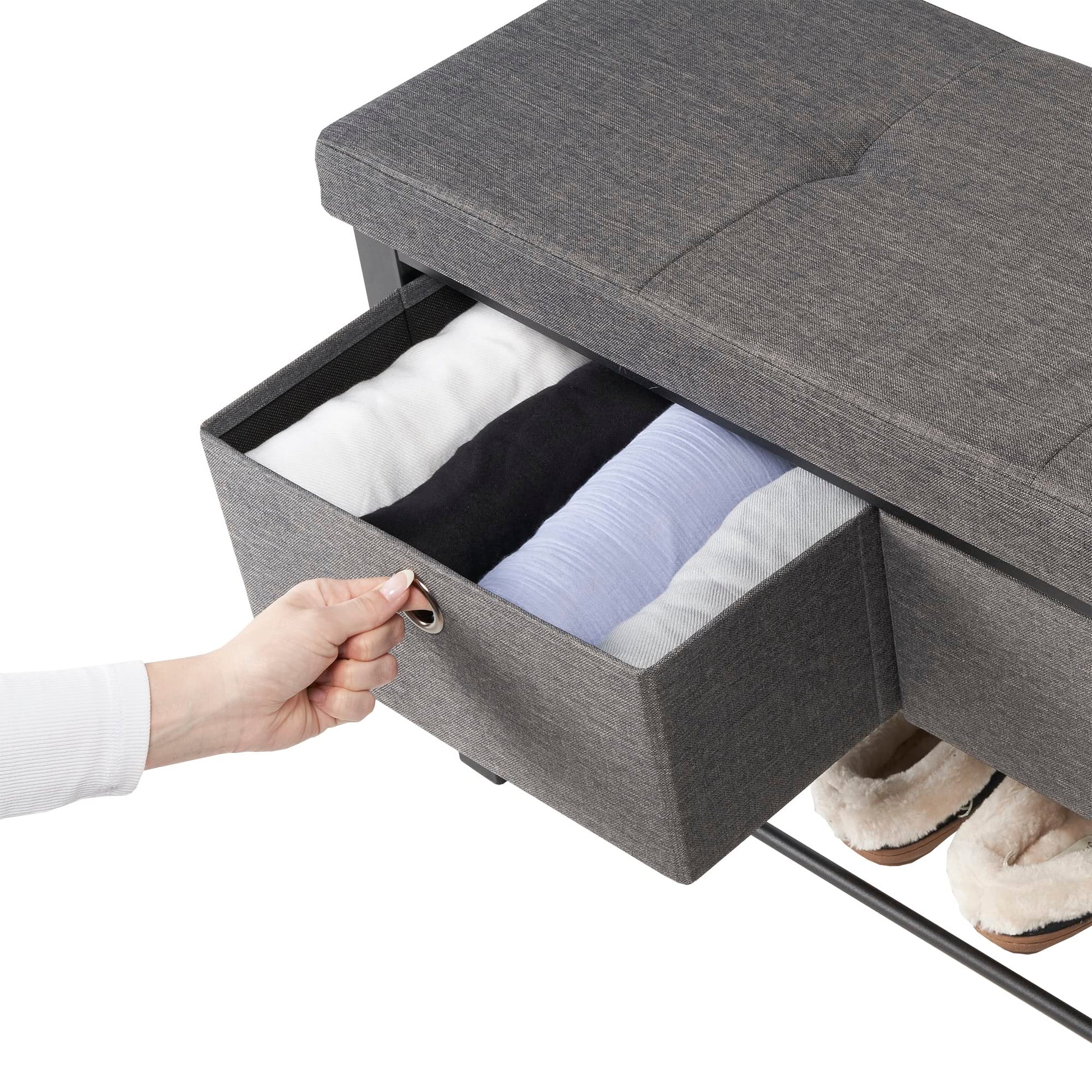 - STURDY UTILITARIAN DESIGN A sturdy metal frame combined with 2 sturdy drawers with metal grommet handles and 2 shoe rack/storage shelf at the base provides multiple storage utility. The compact profile of the storage ottoman fits neatly within small spaces.