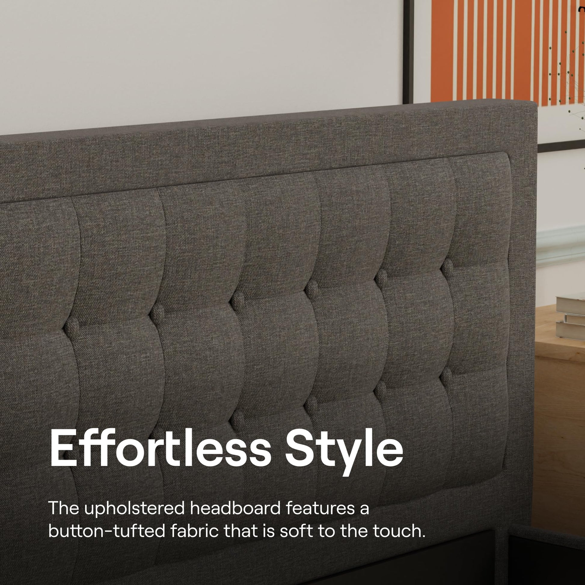 - CLASSIC CONTEMPORARY STYLE - The upholstered headboard features a button-tufted fabric that is soft to the touch, in either gray or linen. The 8-inch legs exude mid-century charm while providing a comfortable height for easy bedtime access.