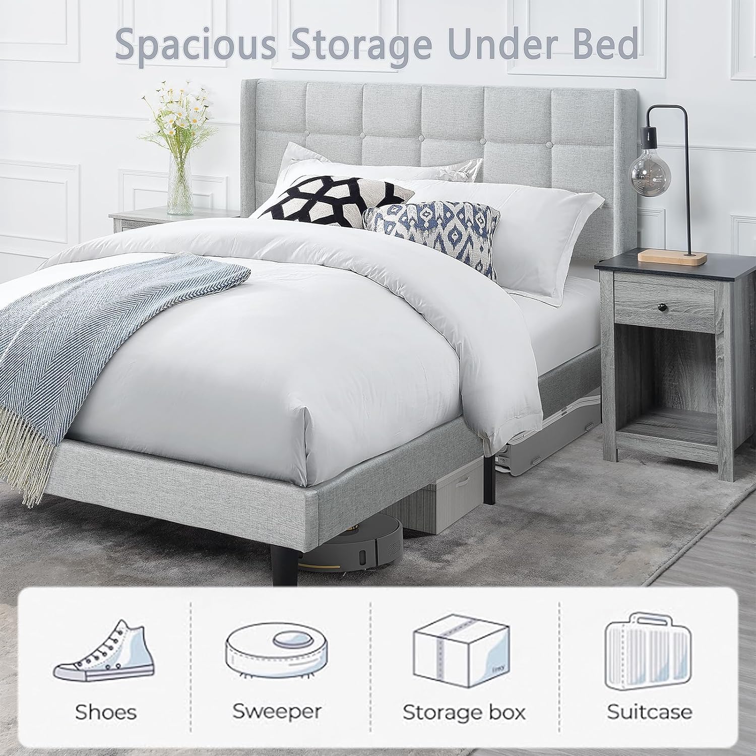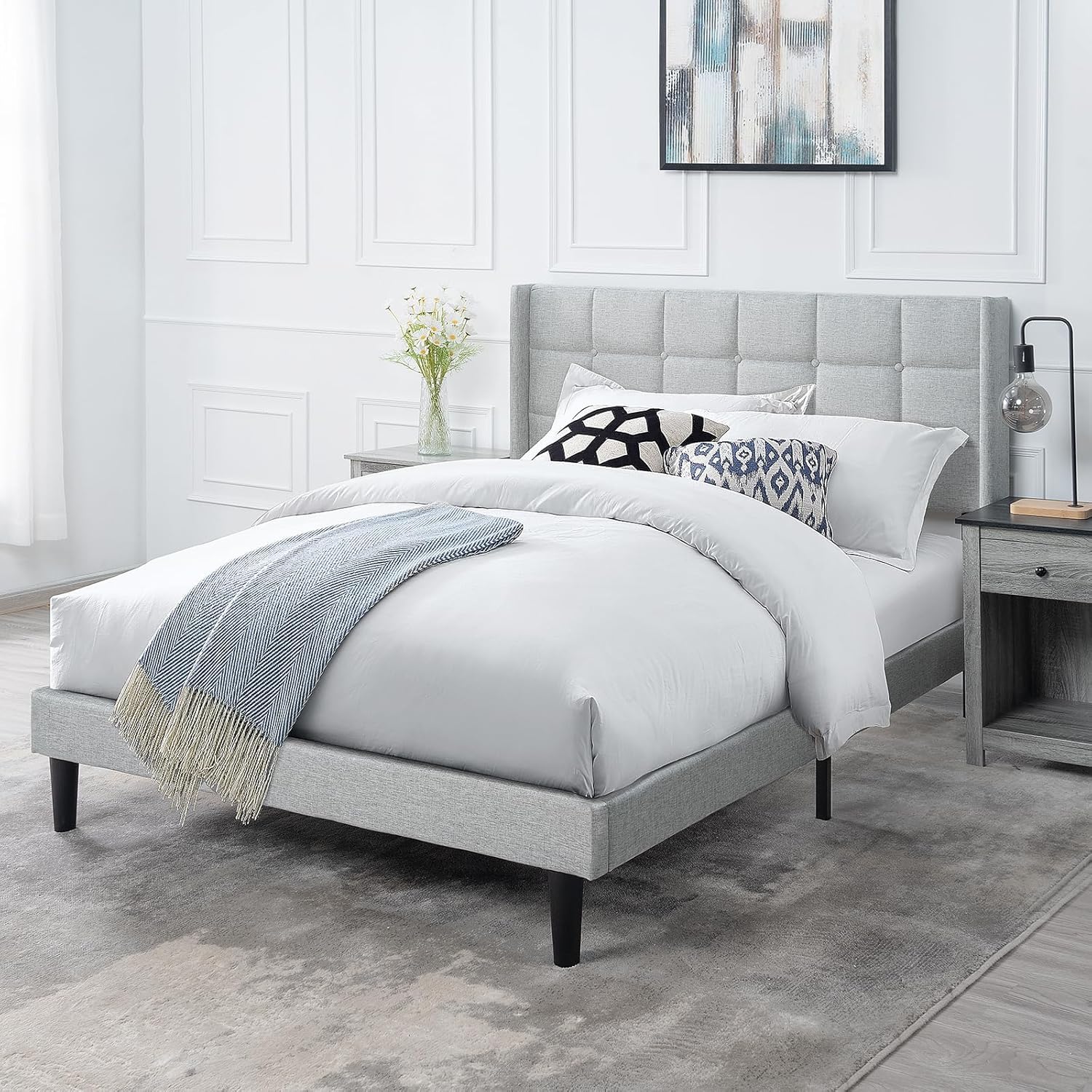- Textile Luxury: The bed frame boasts a premium quality linen fabric that's gentle to the skin, providing a comforting touch and a luxurious sleeping experience. The fabric is soft and comfortable, ensuring a pleasant tactile experience.